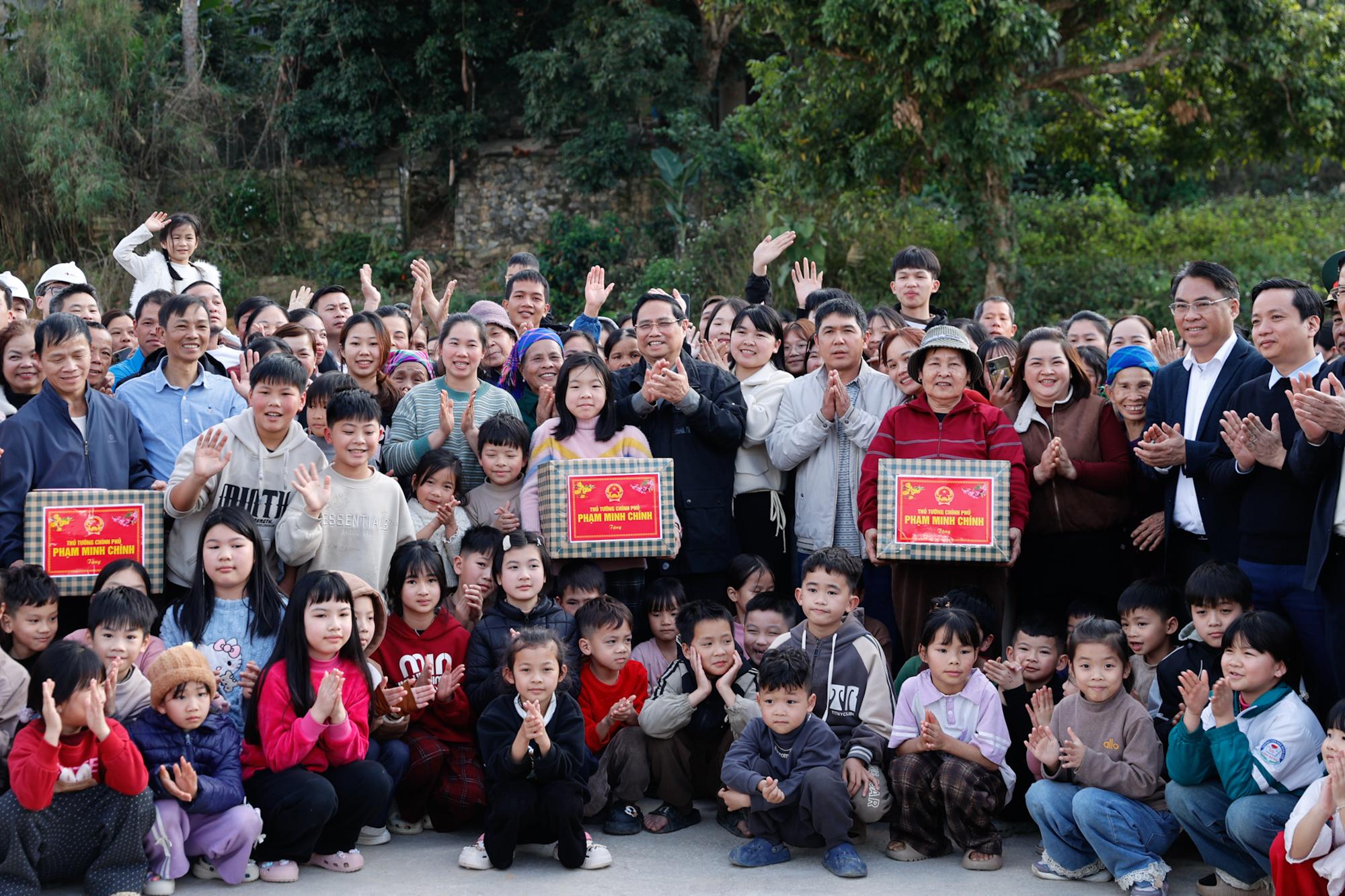 Thủ tướng tặng quà các gia đình trong khu tái định cư Đông Khê. (Ảnh: VGP)