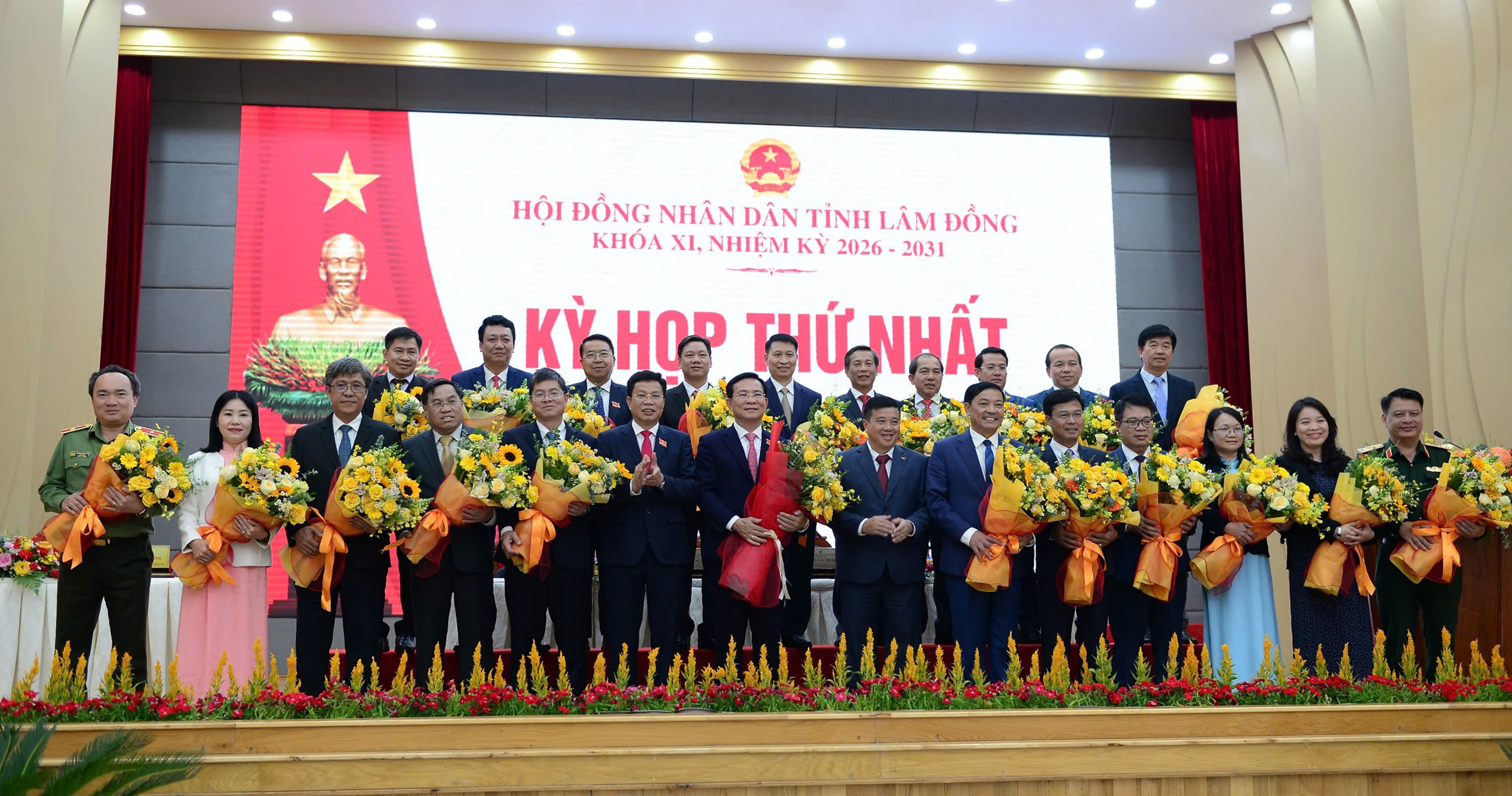 Bí thư Tỉnh ủy và Chủ tịch HĐND tỉnh Lâm Đồng tặng hoa cho Chủ tịch, sáu Phó Chủ tịch và các thành viên UBND tỉnh Lâm Đồng.