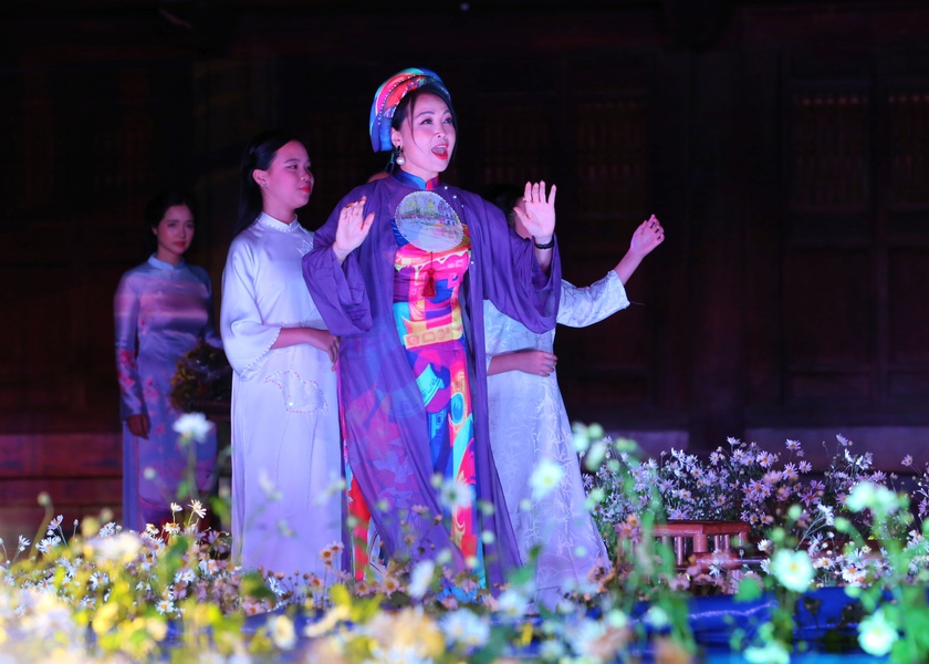 Trình diễn áo dài Việt Nam kết hợp với ánh sáng công nghệ 3D mapping tại Hà Nội. Ảnh: NVT