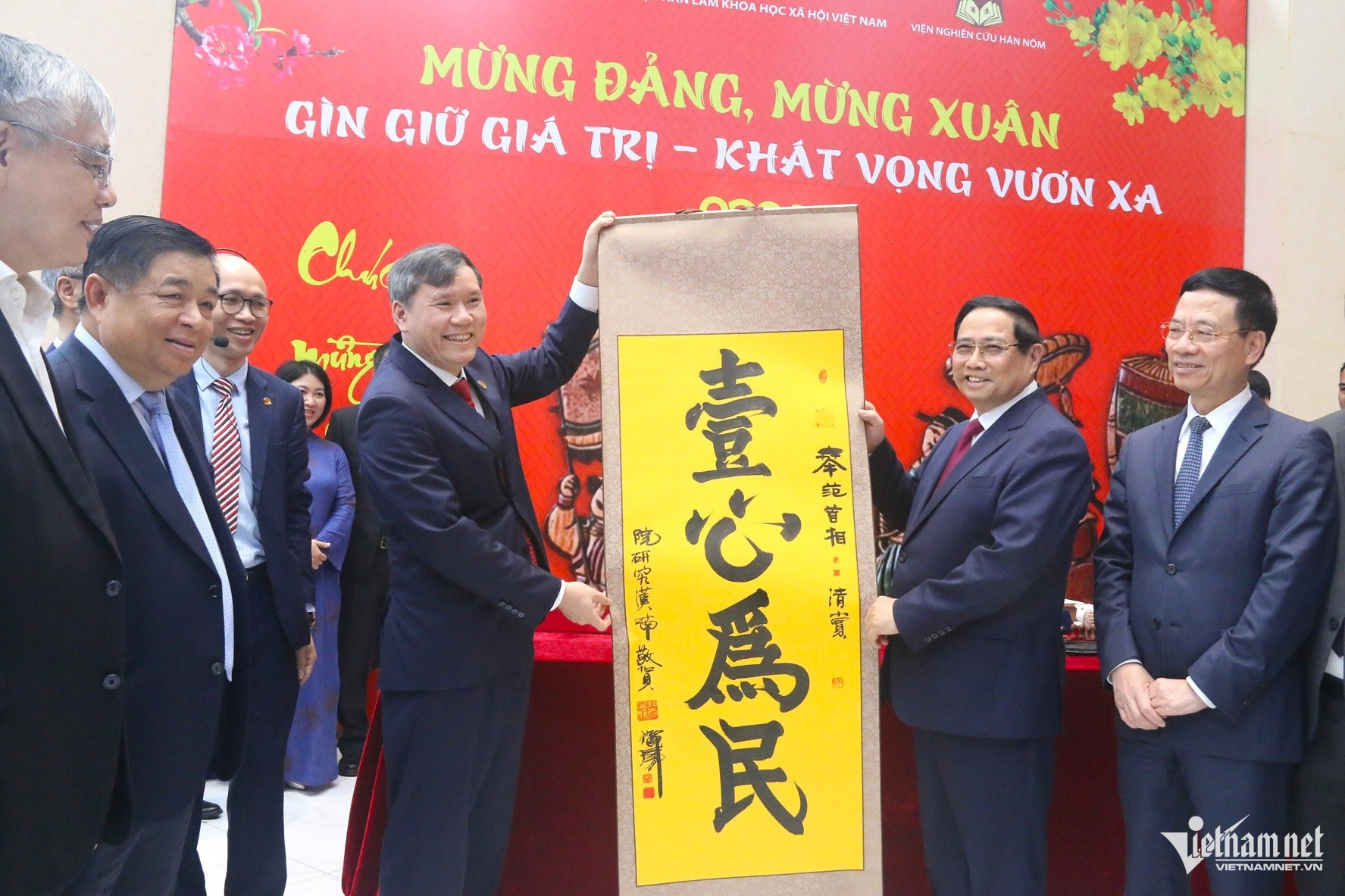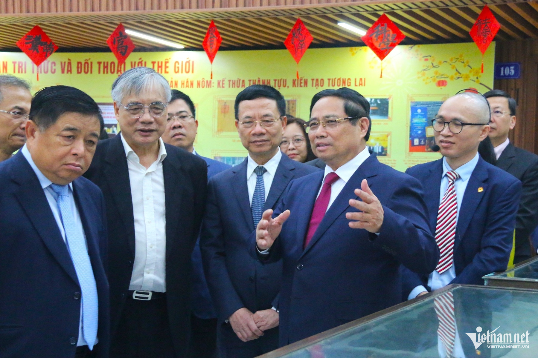 Thủ tướng Phạm Minh Chính tham quan không gian trưng bày về Hán Nôm tại Viện Hàn lâm Khoa học xã hội Việt Nam. Ảnh: Thanh Hùng