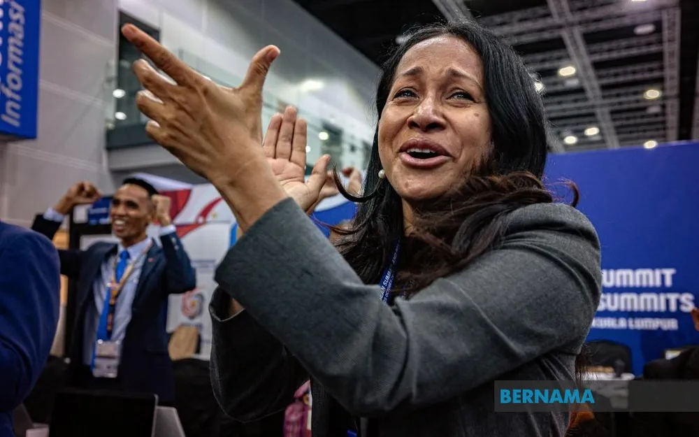 Thành viên phái đoàn Timor-Leste – bà Fransisca Maia bày tỏ sự xúc động tại lễ ký tuyên bố công nhận Timor-Leste là thành viên chính thức của ASEAN hôm 26-10. Ảnh: BERNAMA