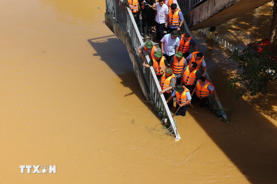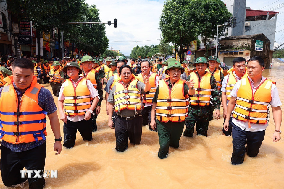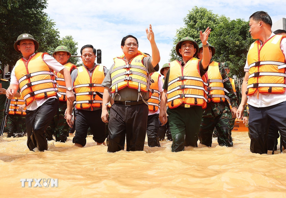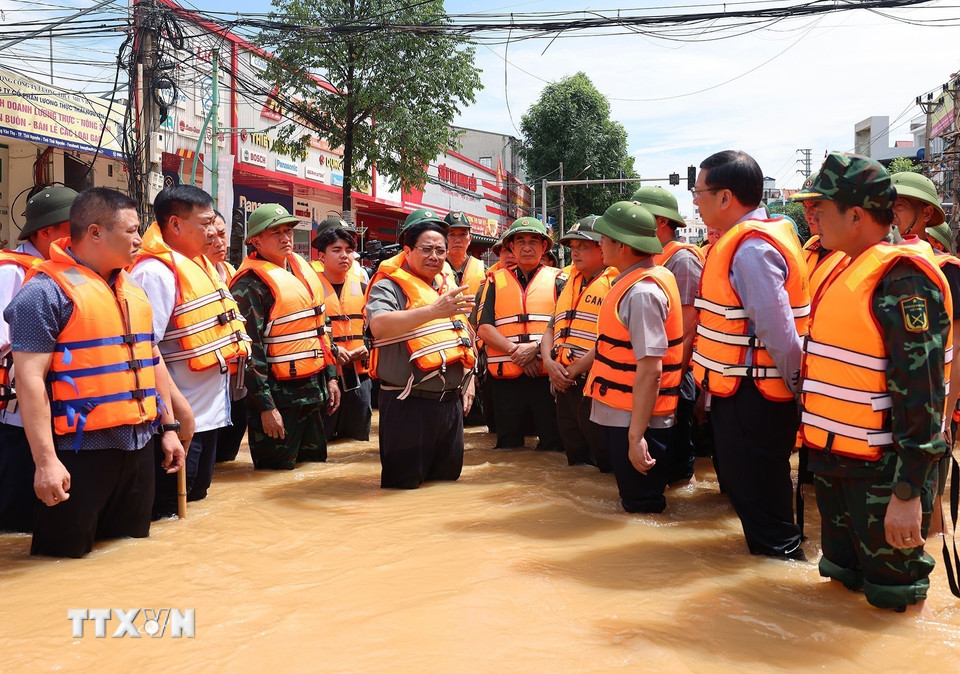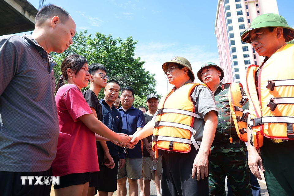 Thủ tướng Phạm Minh Chính chỉ đạo công tác cứu hộ, cứu nạn và động viên nhân dân khu vực ngập lụt tại Thái Nguyên. (Ảnh: Dương Giang/TTXVN)