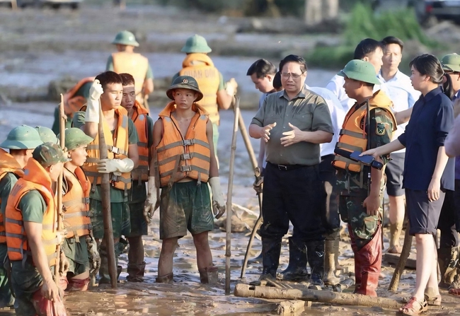 Thủ tướng Phạm Minh Chính tới hiện trường vụ sạt lở đất vùi lấp thôn Làng Nủ (Lào Cai) sau bão số 3 Yagi làm 60 người tử vong, 7 người mất tích tích hồi tháng 9-2024.