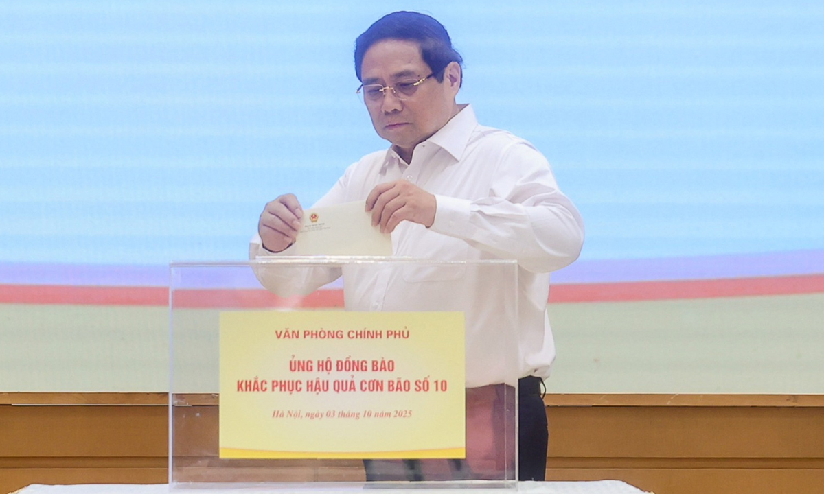 Thủ tướng Phạm Minh Chính tham gia quyên góp, ủng hộ đồng bào bị thiệt hại do cơn bão số 10 gây ra. (Ảnh: VGP)