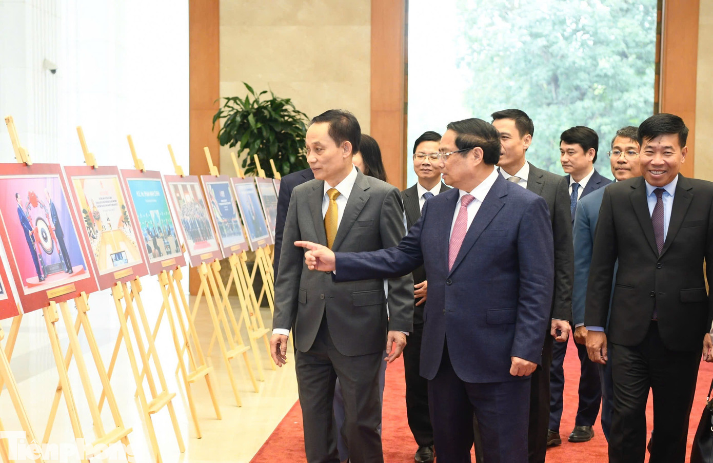 Thủ tướng Phạm Minh Chính xem trưng bày ảnh các thành tựu ngoại giao trước khi dự hội nghị. Ảnh: Như Ý