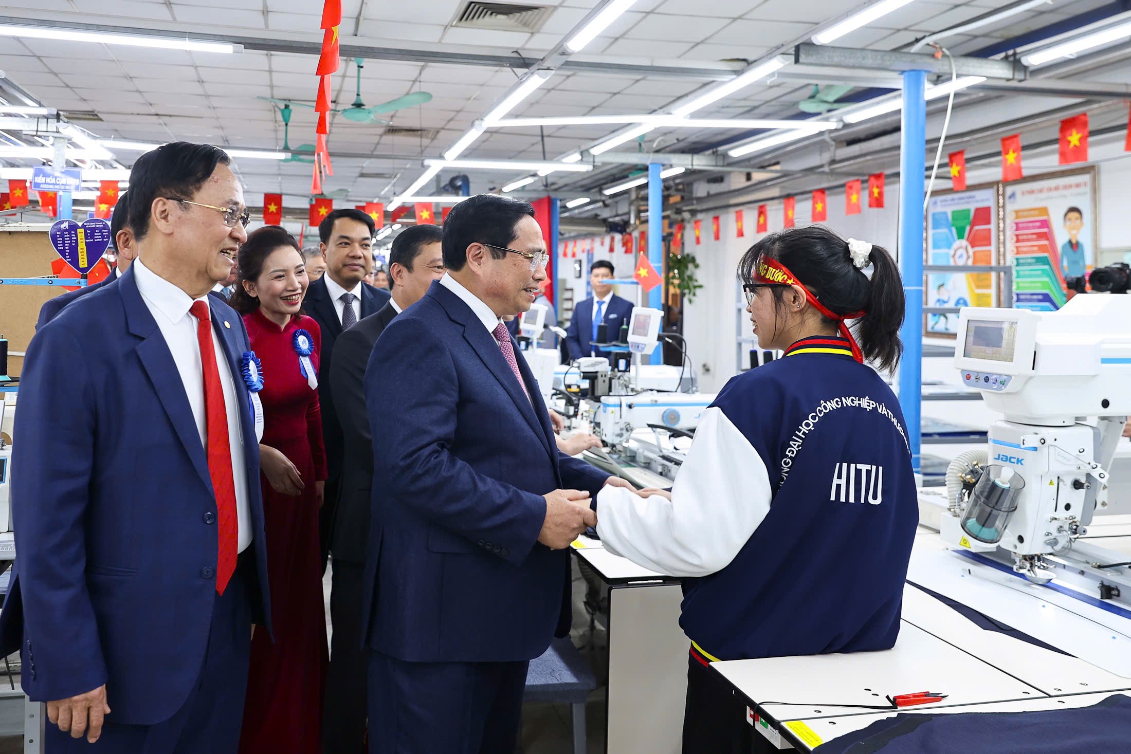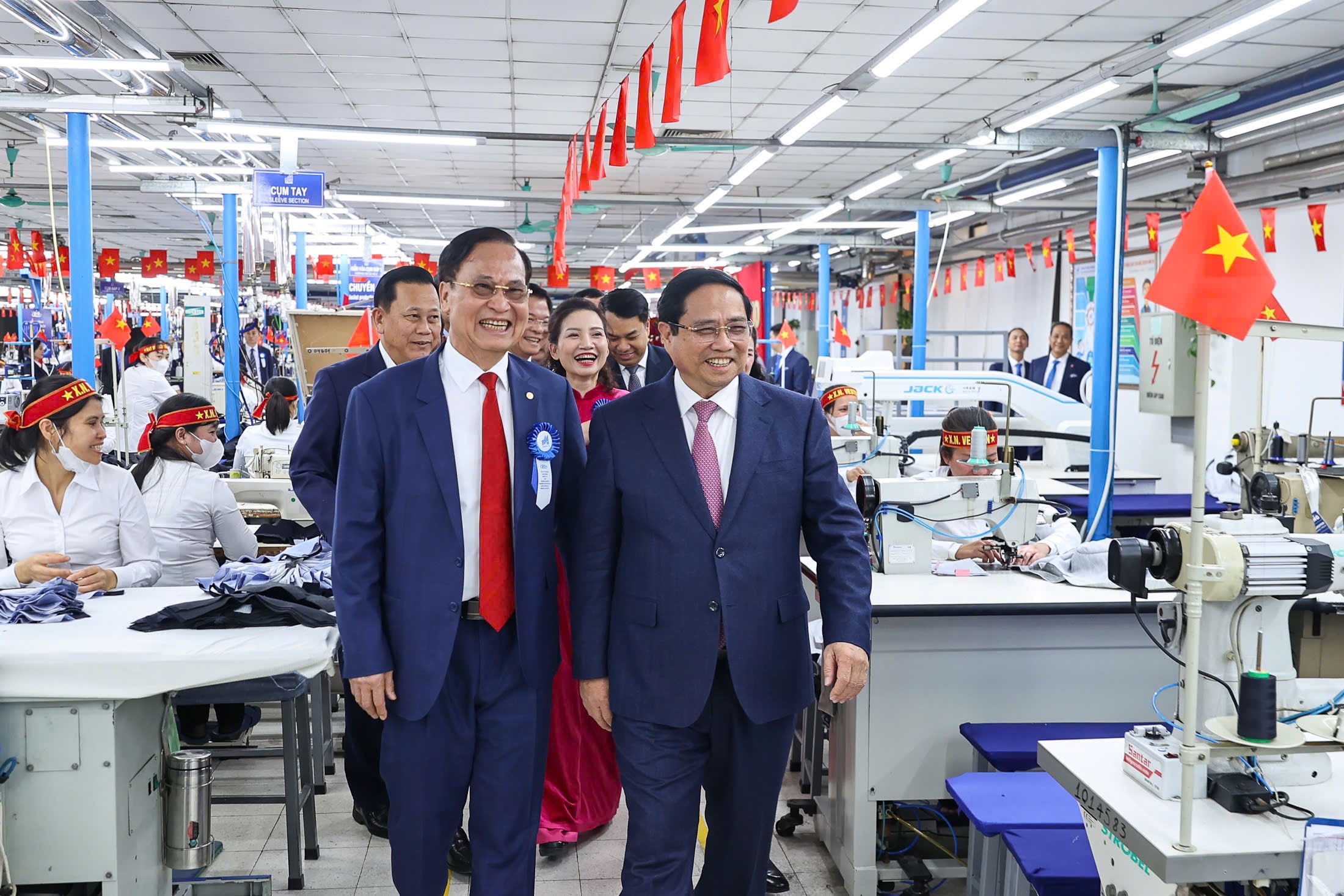 Thủ tướng Phạm Minh Chính thăm các phân xưởng sản xuất tại Tổng công ty May 10 ở Hà Nội chiều 8-1. Ảnh: VIẾT CHUNG