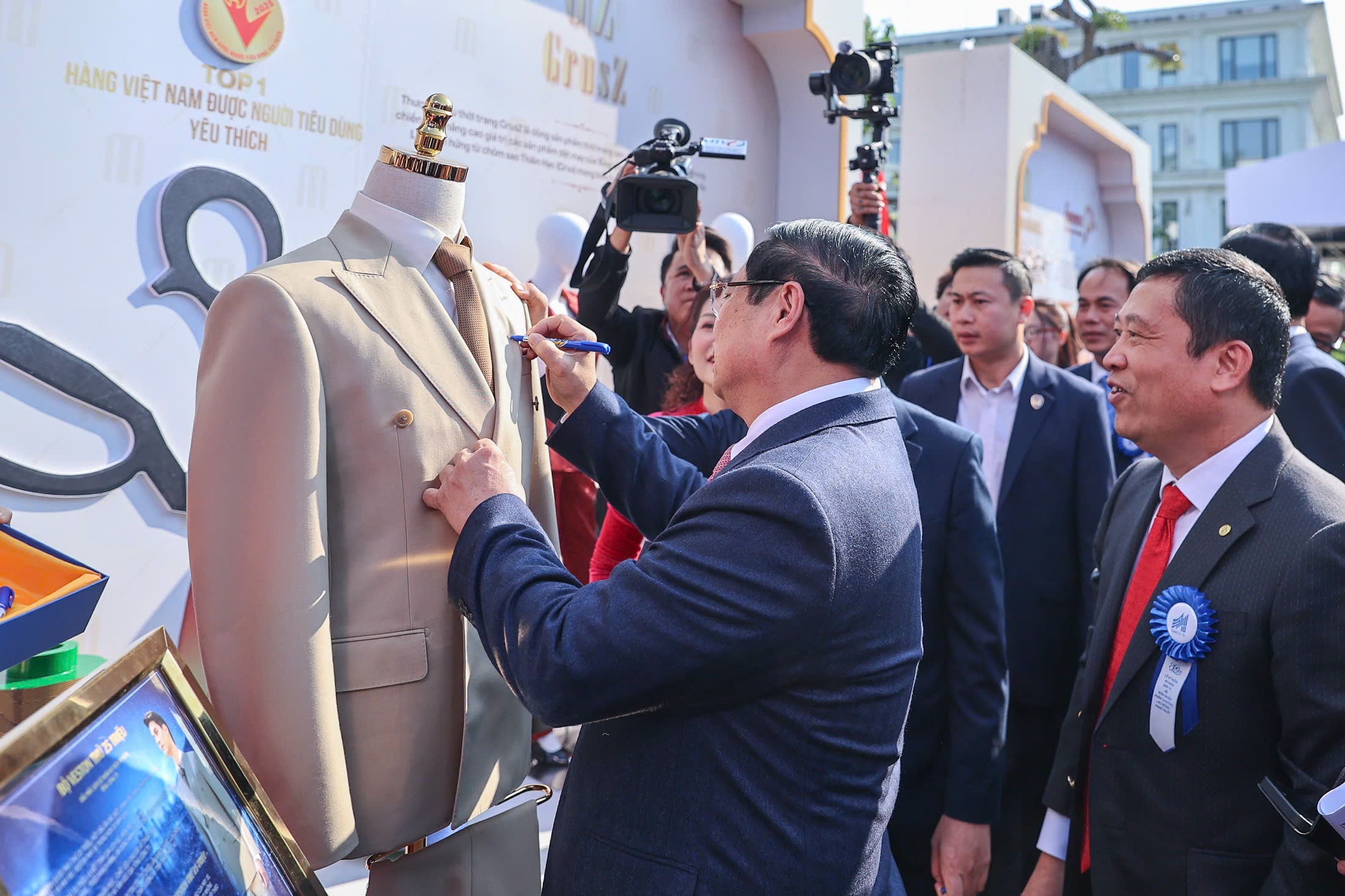 Thủ tướng Phạm Minh Chính tham quan các sản phẩm của May 10 trưng bày tại lễ đón nhận Huân chương Lao động hạng nhất. Ảnh: VIẾT CHUNG