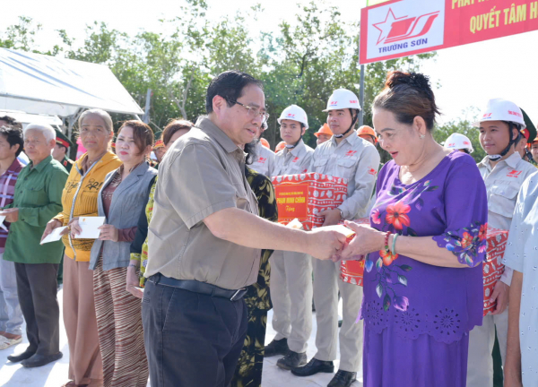 Thủ tướng Phạm Minh Chính tặng quà các hộ dân trên địa bàn xã Đất Mũi, tỉnh Cà Mau (ảnh Tâm Đông).