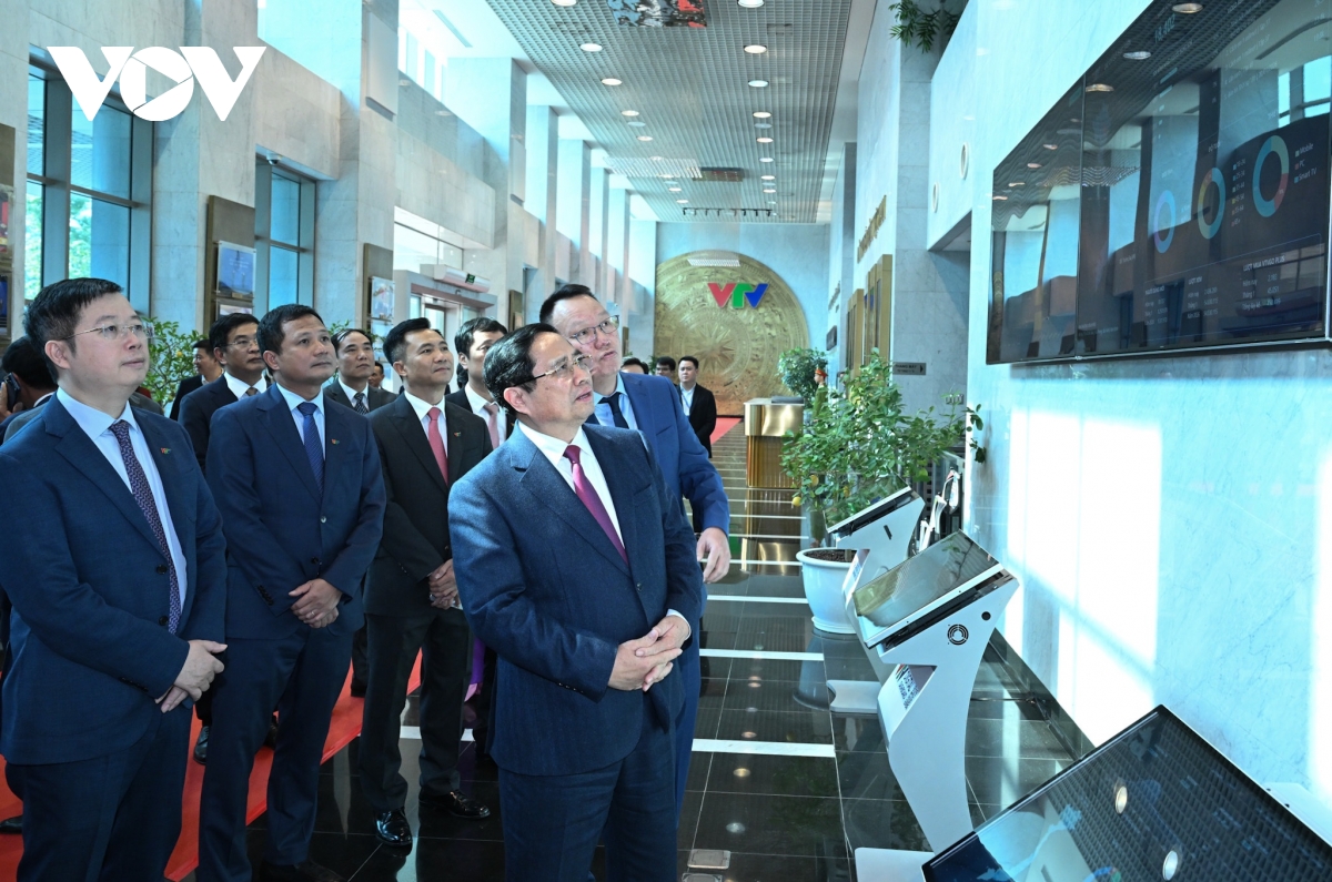 Thủ tướng Phạm Minh Chính nghe giới thiệu về sự phát triển của Đài Truyền hình Việt Nam.
