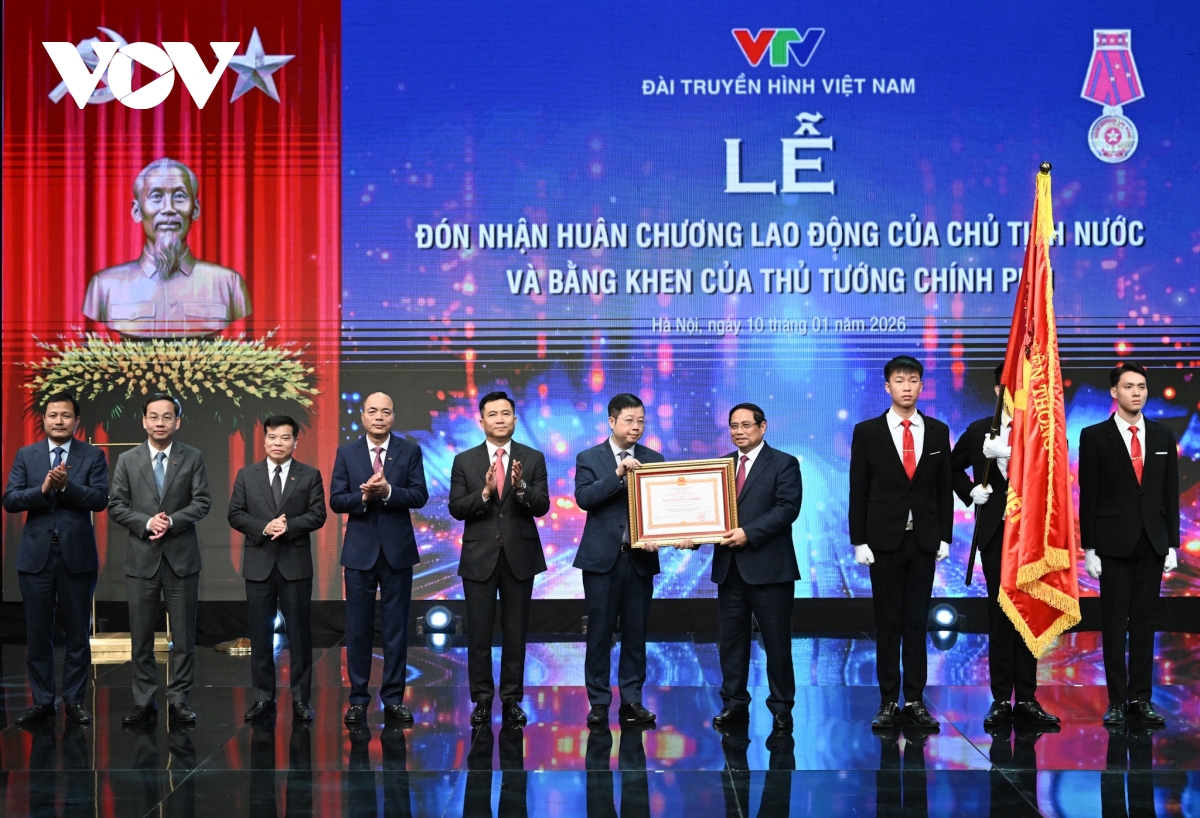 Nhân dịp này, Thủ tướng Phạm Minh Chính trao Huân chương lao động hạng Nhất cho VTV, ghi nhận thành tích xuất sắc của VTV vào sự phát triển kinh tế - xã hội đất nước.