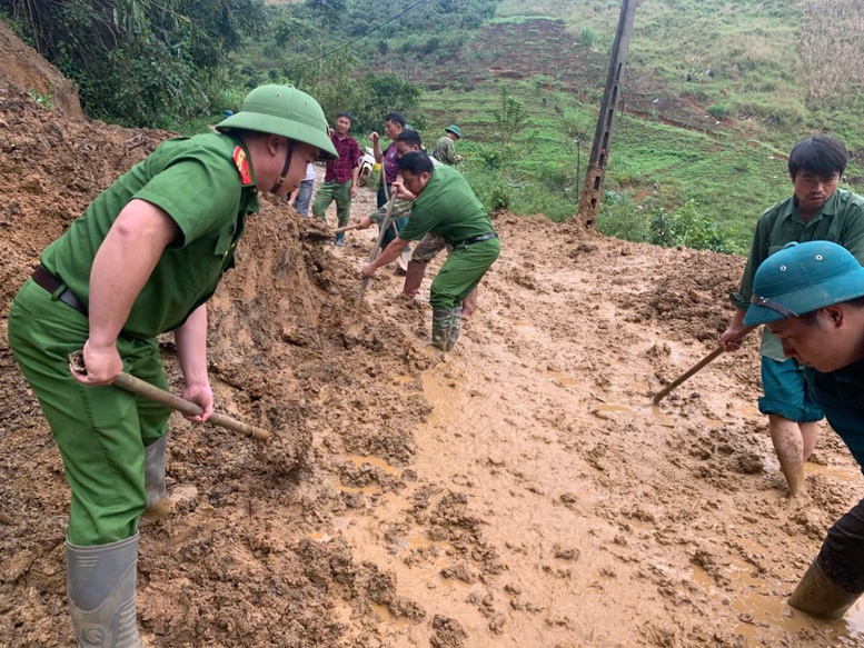 Công an xã Lóng Phiêng (tỉnh Sơn La) giúp dân san lấp bùn đất do mưa lũ kéo dài.