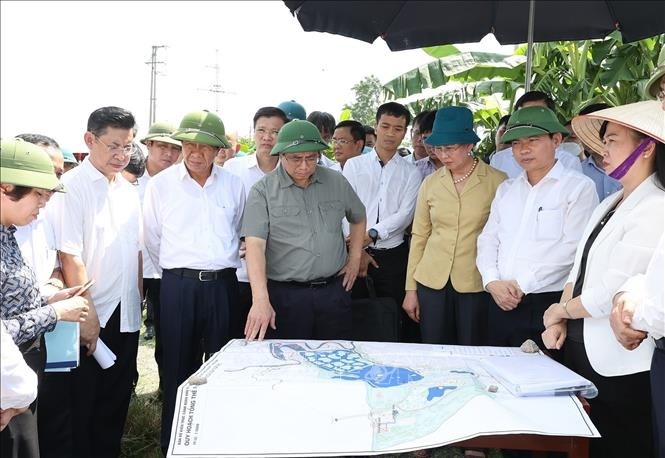 Thủ tướng Phạm Minh Chính kiểm tra, chỉ đạo tháo gỡ vướng mắc thực hiện các dự án bệnh viện Trung ương tuyến cuối tại Hà Nam (cũ), tháng 8.2022. Ảnh: Nhật Bắc