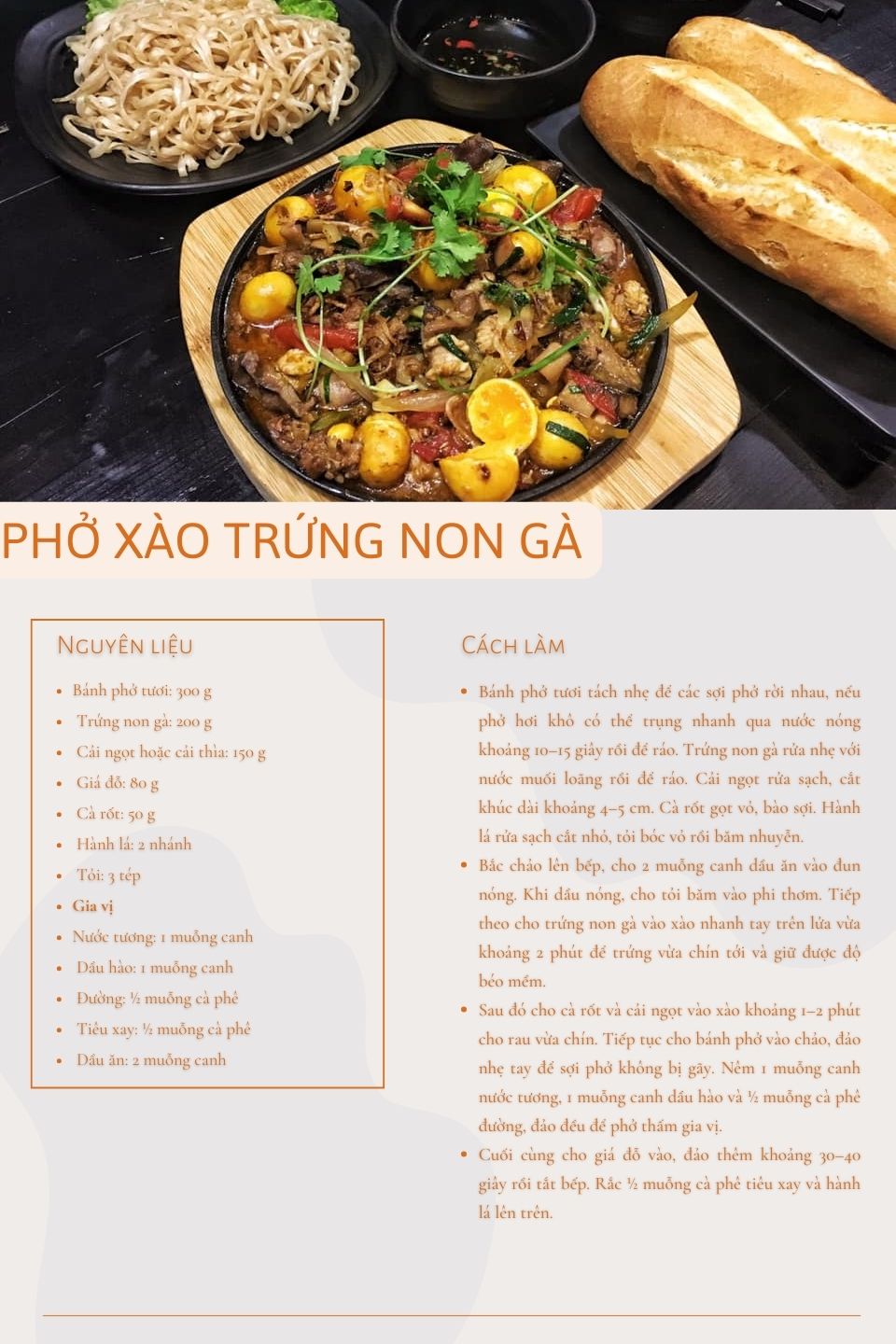 Bên cạnh trứng non gà và bánh phở, món ăn thường kết hợp với các loại rau củ quen thuộc như cải ngọt, cải thìa, giá đỗ hoặc cà rốt thái sợi. Những nguyên liệu này không chỉ giúp cân bằng hương vị mà còn tạo thêm màu sắc bắt mắt cho món ăn. Khi xào trên lửa lớn, rau vừa chín tới vẫn giữ độ giòn, góp phần làm cho tổng thể món ăn thêm phần đặc sắc.