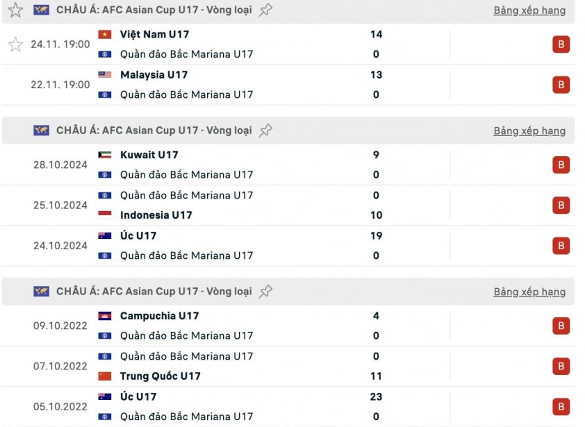 Với 27 bàn thua và không ghi được bàn thắng nào chỉ sau hai trận đấu, U17 Quần đảo Bắc Mariana đã trải qua một khởi đầu đầy khó khăn tại Vòng loại U17 châu Á 2026. Đội bóng này lần lượt nhận thất bại 0-13 trước U17 Malaysia và 0-14 trước U17 Việt Nam, qua đó trở thành đội bóng để thủng lưới nhiều nhất giải.
