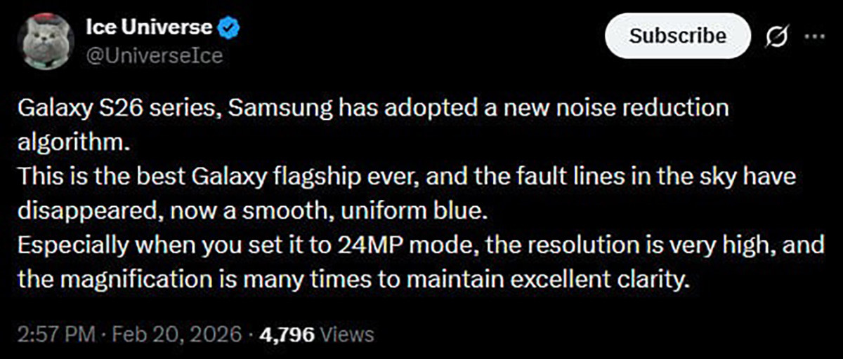 Theo thông tin từ chuyên gia rò rỉ Ice Universe, thay vì chỉ tập trung vào việc thay đổi thông số phần cứng, Samsung đang dồn lực vào việc phát triển thuật toán giảm nhiễu thế hệ mới cho Galaxy S26. Sự kết hợp giữa hệ thống phần cứng hiện có và công nghệ xử lý phần mềm tiên tiến này được kỳ vọng sẽ tạo ra một bước nhảy vọt về chất lượng ảnh chụp, giúp Samsung củng cố vị thế trong cuộc đua nhiếp ảnh di động.
