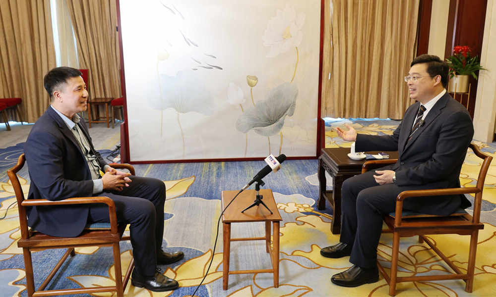 Ông Vi Thao (phải), Ủy viên Trung ương Đảng Cộng sản Trung Quốc, Phó Bí thư Đảng ủy, Chủ tịch Chính quyền nhân dân Khu tự trị dân tộc Choang Quảng Tây (Trung Quốc) trả lời phỏng vấn phóng viên TTXVN tại Trung Quốc.