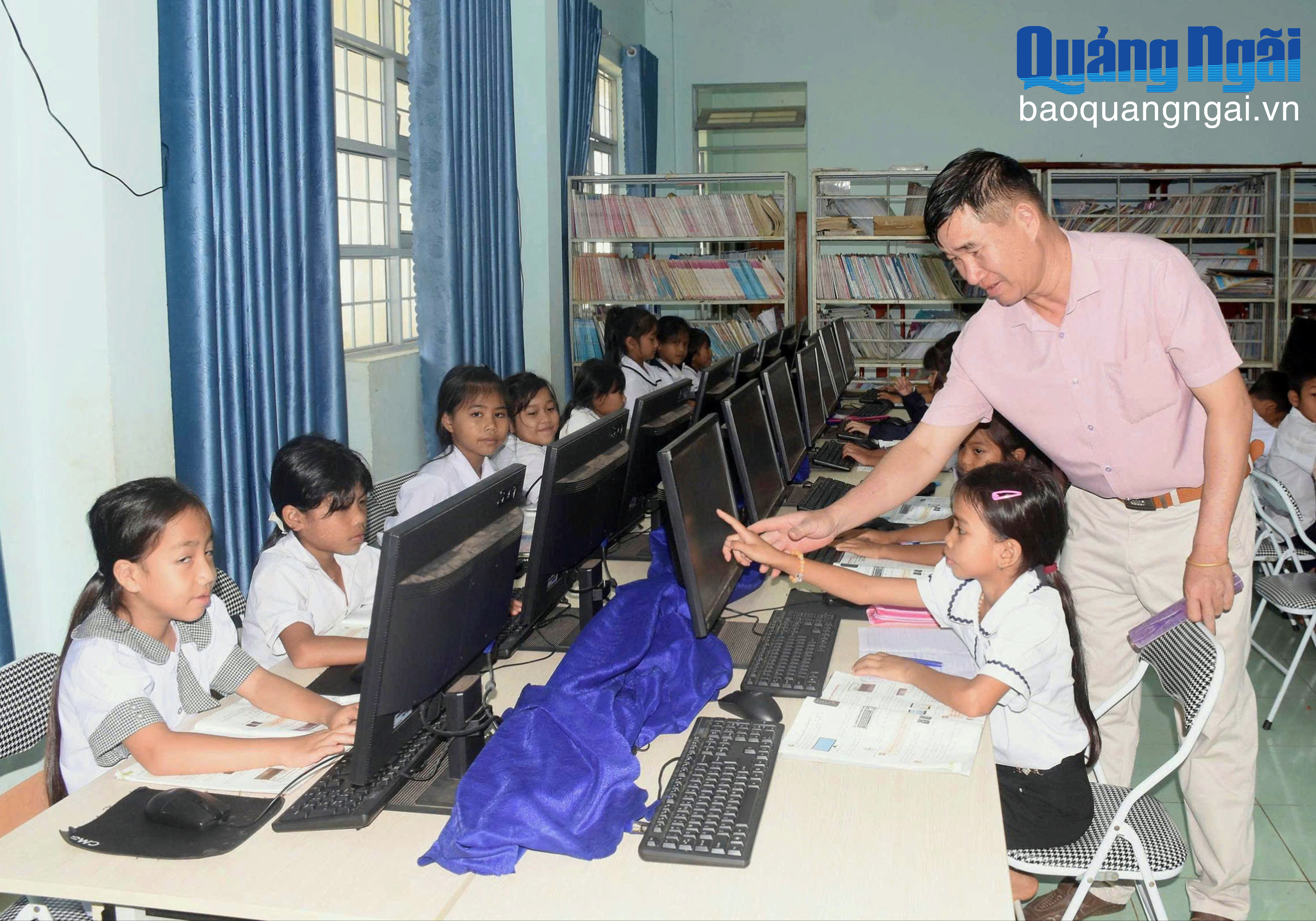 Giáo viên Trường Tiểu học và THCS Đăk Năng, xã Ia Chim hướng dẫn kỹ năng sử dụng mạng xã hội an toàn cho học sinh. Ảnh: H.TIẾN