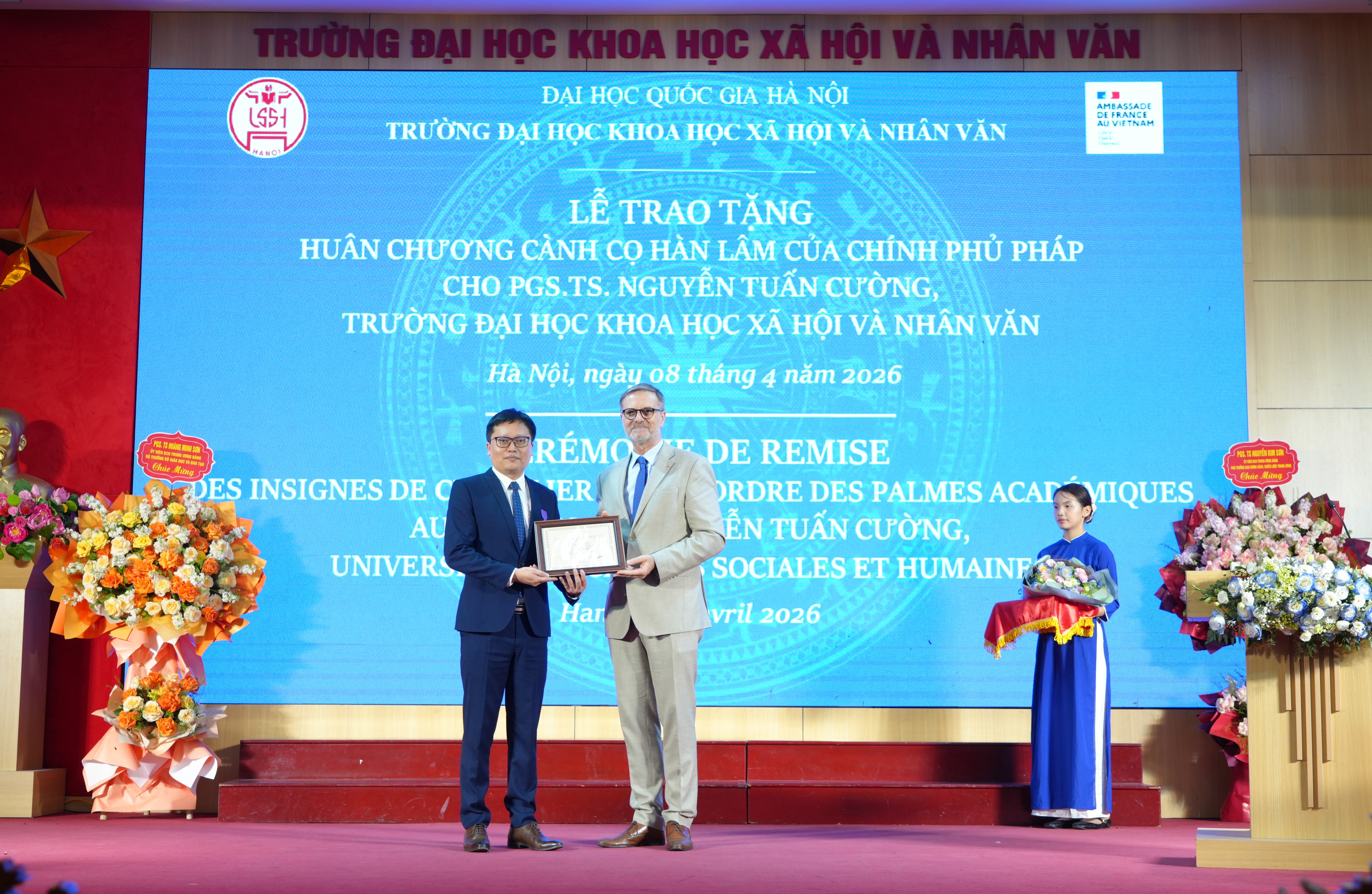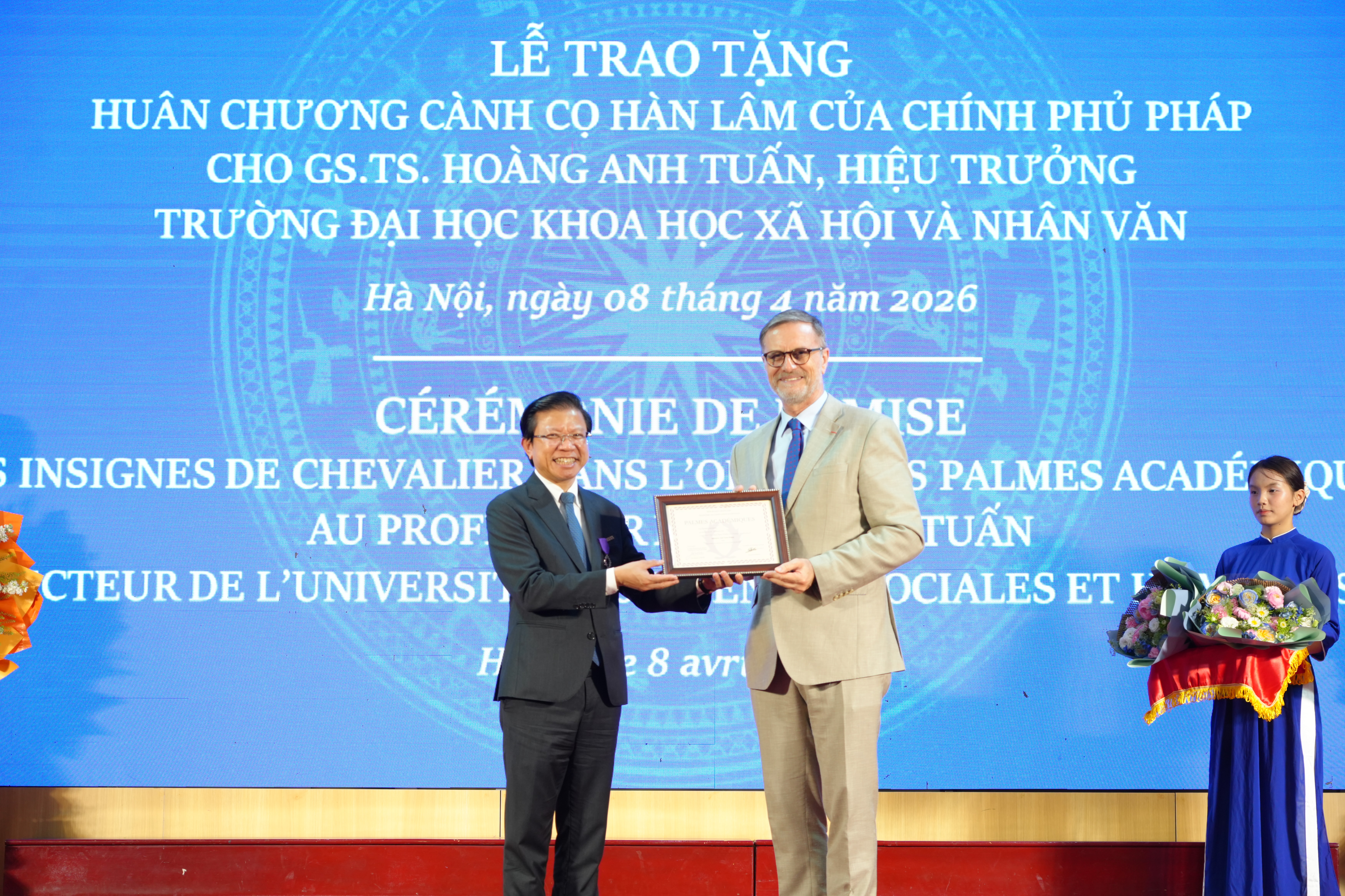 Trong tâm điểm của chương trình là lễ trao tặng Huân chương Cành cọ Hàn lâm cho GS.TS Hoàng Anh Tuấn, Hiệu trưởng Trường Đại học Khoa học Xã hội và Nhân văn, và PGS.TS Nguyễn Tuấn Cường, Nghiên cứu viên cao cấp của trường. Đây là sự ghi nhận của Chính phủ Pháp đối với những đóng góp nổi bật của hai nhà khoa học trong nghiên cứu, giáo dục, văn hóa và thúc đẩy hợp tác học thuật quốc tế, đặc biệt với các đối tác Pháp.