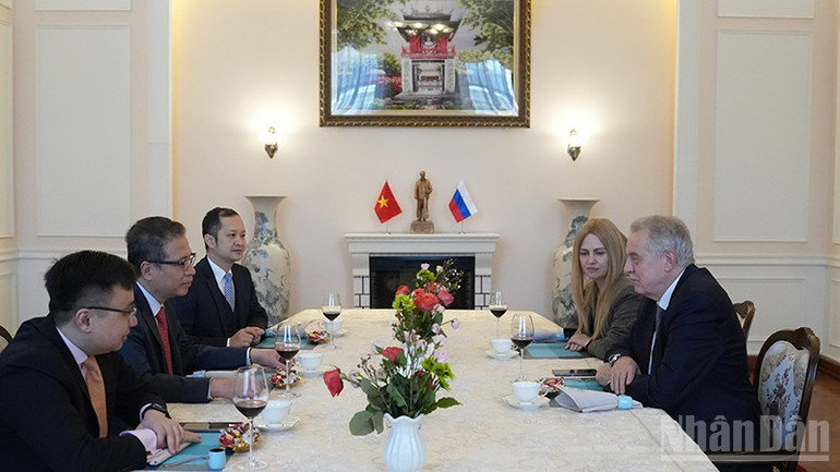Đại sứ cho biết, quan hệ Đối tác chiến lược toàn diện 2 nước đang ở giai đoạn phát triển năng động, đồng thời thông tin cho ông Evgeny Grigoriev những định hướng quan trọng Đại hội XIV của Đảng Cộng sản Việt Nam và cuộc điện đàm cấp cao giữa lãnh đạo cấp cao hai nước đầu năm 2026.