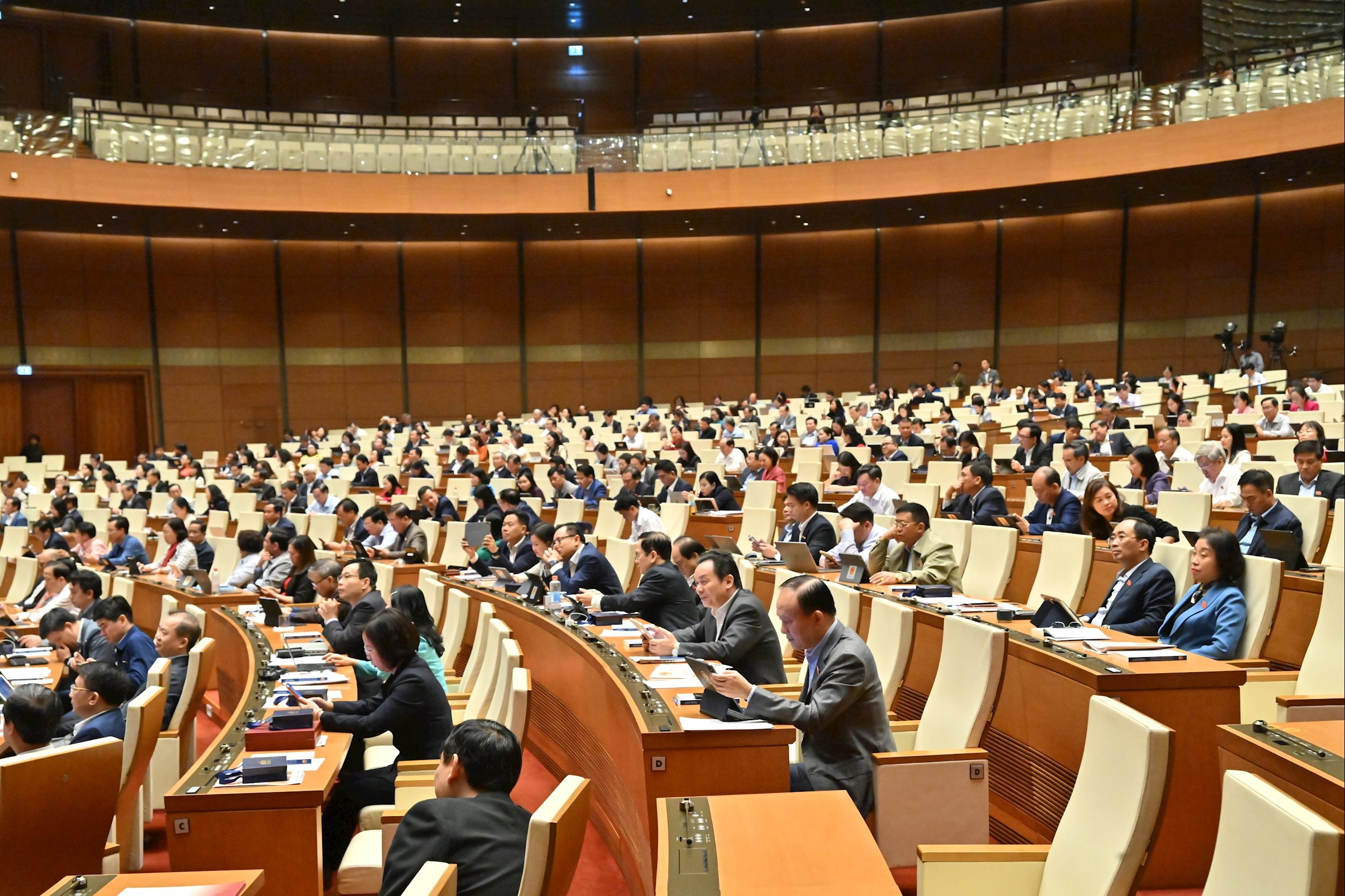Quốc hội biểu quyết thông qua Nghị quyết về tiếp tục nâng cao hiệu lực, hiệu quả việc thực hiện chính sách, pháp luật về bảo vệ môi trường với tỷ lệ 442/444 tổng số ĐBQH có mặt tán thành. Ảnh: Phạm Thắng