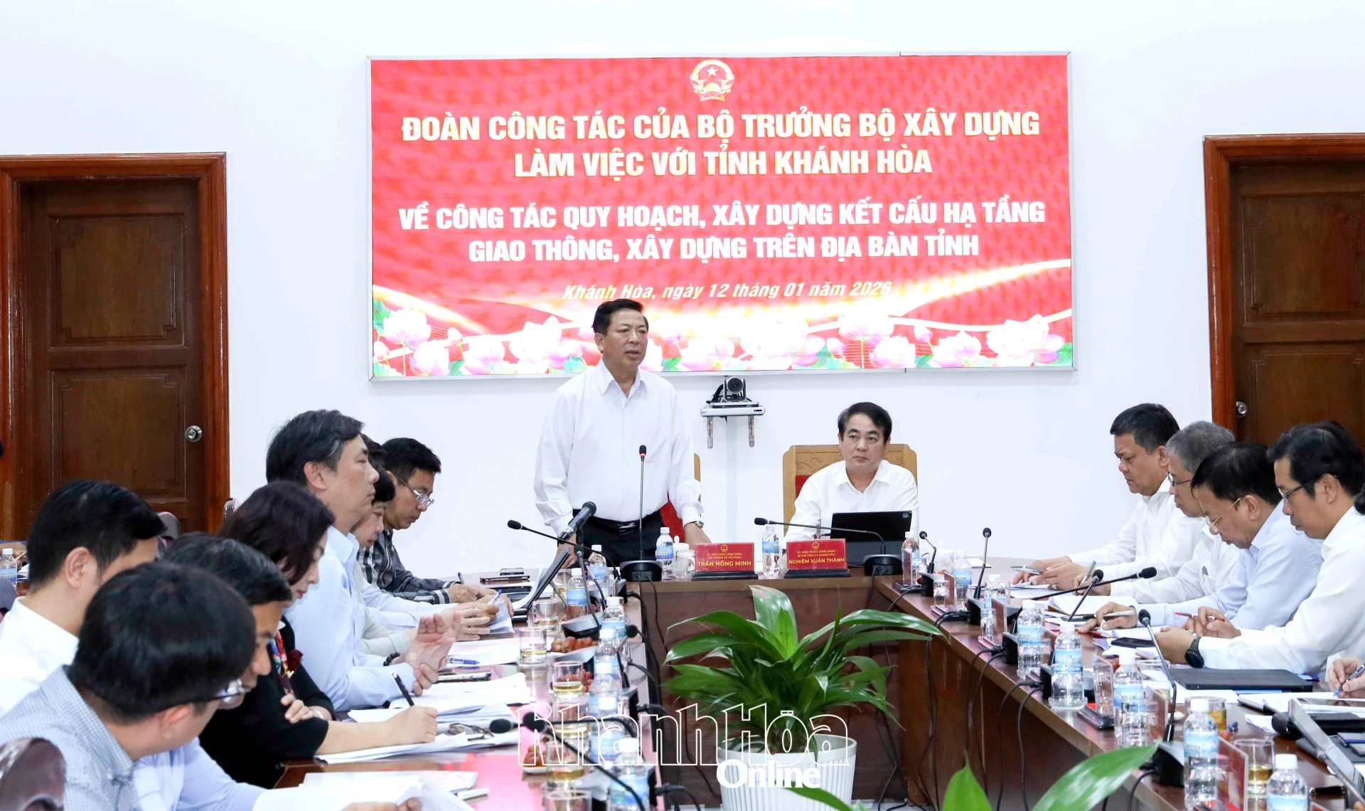 Phát biểu tại buổi làm việc, Bí thư Tỉnh ủy NGHIÊM XUÂN THÀNH nhấn mạnh: Năm 2025, tỉnh đã có những bước tiến quan trọng trong phát triển kinh tế - xã hội, trong đó ngành xây dựng đóng góp đáng kể. Thu ngân sách đạt gần 39.000 tỷ đồng, trong tuần đầu năm 2026 ước đạt khoảng 3.000 tỷ đồng, hứa hẹn tiềm năng thu ngân sách rất tốt. Một số ngành, lĩnh vực đạt mức tăng trưởng cao so với kế hoạch, song tiến độ triển khai một số dự án lớn chưa phát huy đóng góp ngay cho tăng trưởng do đang hoàn tất thủ tục đầu tư hoặc mới được chấp thuận chủ trương vào cuối kỳ. Đồng chí nhấn mạnh, định hướng phát triển kinh tế - xã hội giai đoạn tới là tiếp tục bám sát các trụ cột đã được xác định, trong đó đô thị, xây dựng và hạ tầng được xem là động lực quan trọng, vừa thúc đẩy tăng trưởng, vừa tạo nguồn thu bền vững cho ngân sách. Việc cân đối thu - chi ngân sách được tỉnh đặc biệt quan tâm, coi đây là tiêu chí then chốt trong lộ trình xây dựng Khánh Hòa trở thành thành phố trực thuộc Trung ương. Ban Thường vụ Tỉnh ủy cũng tập trung chỉ đạo, tháo gỡ khó khăn, xem xét và phê duyệt nhiều dự án quy mô lớn. Các dự án động lực tại khu vực Bắc Vân Phong và khu vực Nha Trang, Cam Lâm được xác định sẽ mở ra dư địa phát triển mới, tạo không gian tăng trưởng dài hạn cho tỉnh. Đồng chí kiến nghị Bộ trưởng Bộ Xây dựng và các cục, vụ thuộc bộ tiếp tục quan tâm, hỗ trợ địa phương trong triển khai các dự án hạ tầng giao thông liên vùng, đặc biệt là các tuyến kết nối giữa miền núi và ven biển, trong đó có Dự án Đường bộ cao tốc Nha Trang - Đà Lạt. Đây là các dự án có ý nghĩa quan trọng thúc đẩy phát triển kinh tế - xã hội, mở rộng không gian du lịch, tăng khả năng thu hút đầu tư và nâng cao đời sống người dân.