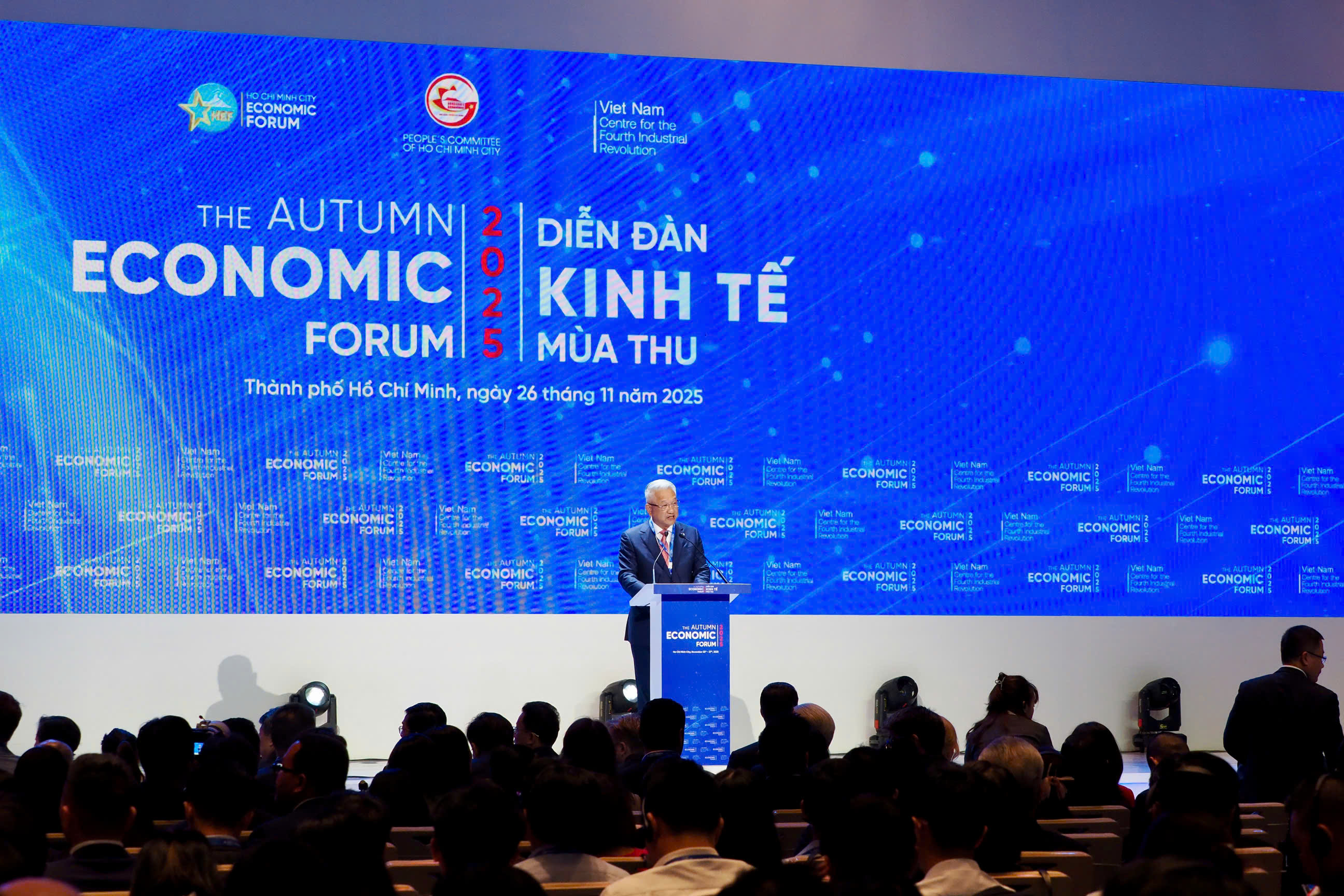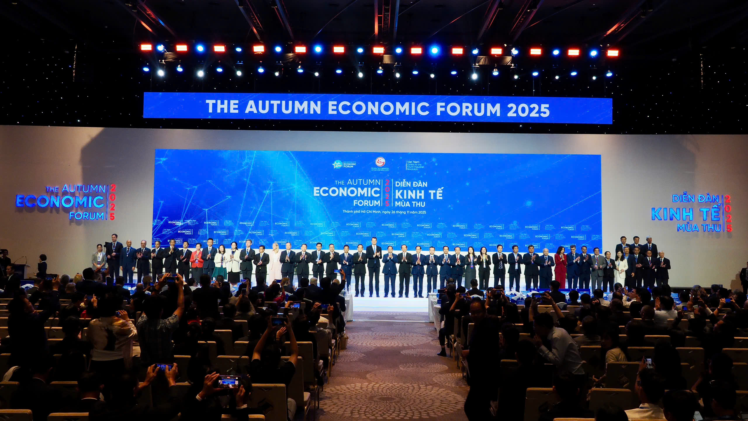 Lãnh đạo Chính phủ, TPHCM tham dự phiên khai mạc và phiên toàn thể Diễn đàn Kinh tế mùa thu 2025, sáng 26-11. Ảnh: HOÀNG HÙNG