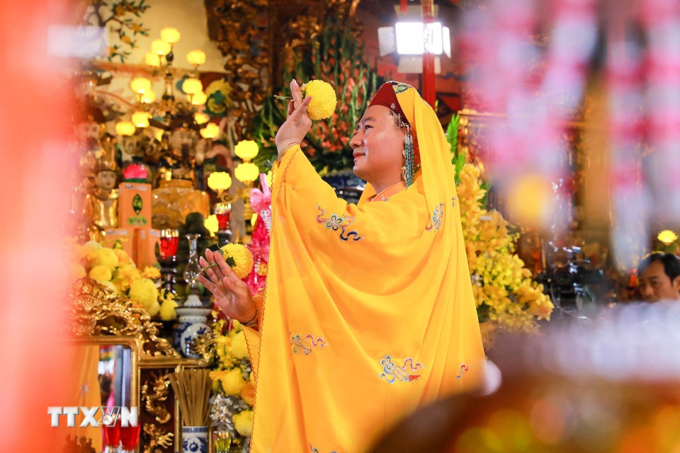 Thanh đồng Lê Thị Liên (tỉnh Lâm Đồng) thực hành nghi lễ Hầu đồng. (Ảnh: Khánh Hòa/TTXVN)