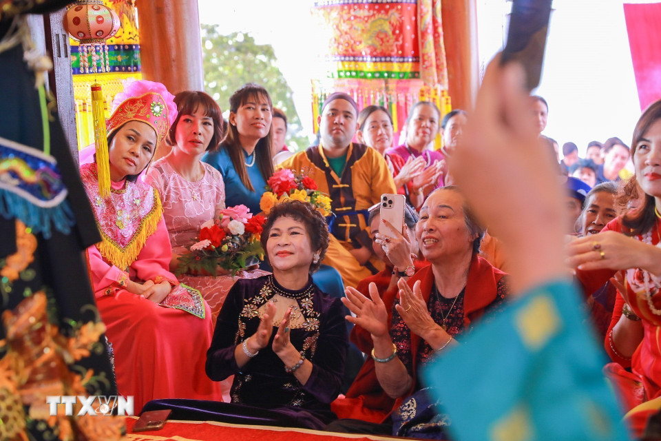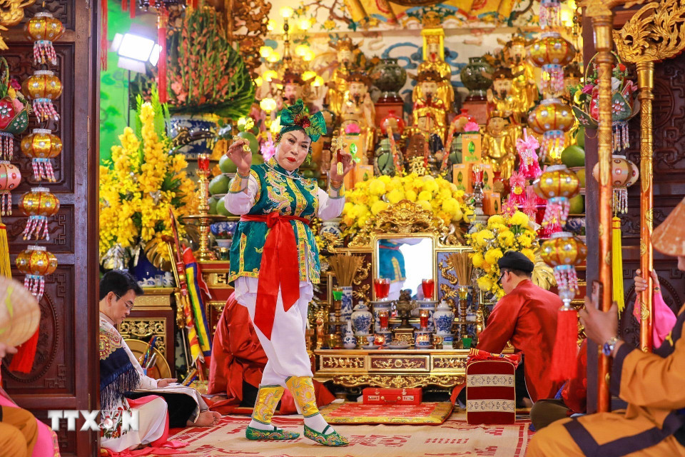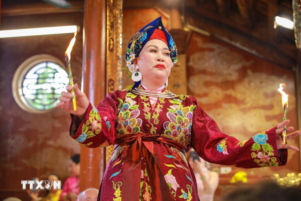 Đồng thầy Đỗ Diệu Trang (Hà Nội) thực hành nghi lễ Hầu đồng. (Ảnh: Khánh Hòa/TTXVN)