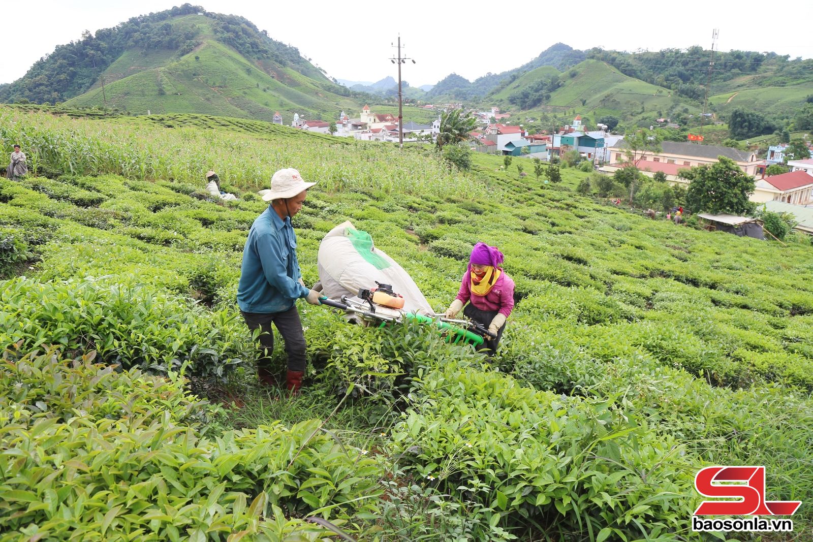 Nông dân bản Mến, xã Tô Múa cơ giới hóa trong thu hái chè.