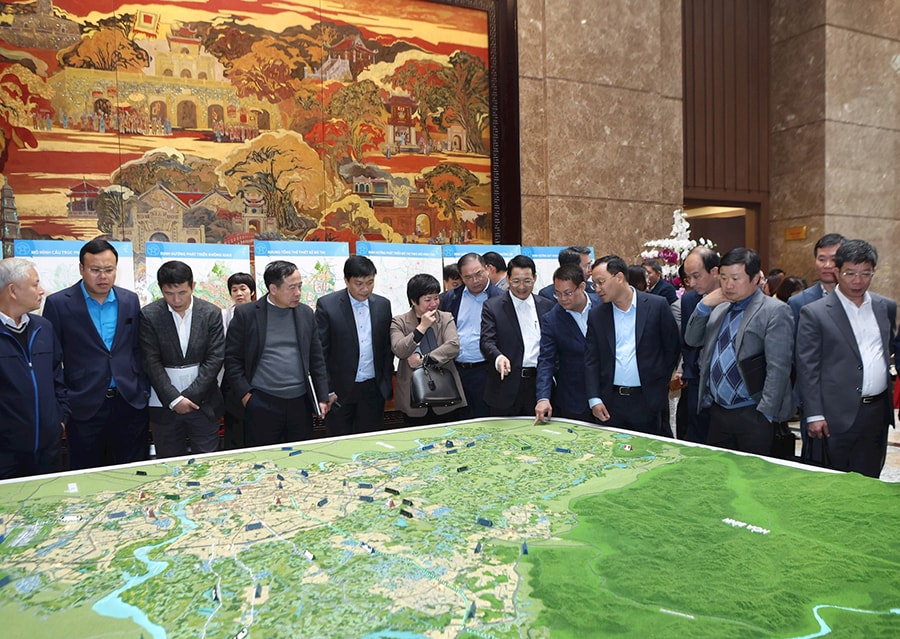 Sa bàn điều chỉnh Quy hoạch chung Thủ đô Hà Nội đến năm 2045, tầm nhìn đến năm 2065 thu hút sự quan tâm của nhiều cán bộ và nhân dân. Ảnh: Viết Thành
