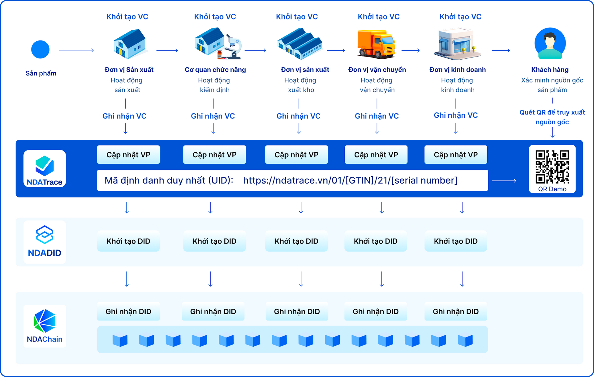 Hiện nay, một trong những giải pháp đang được phát triển theo hướng này là NDATrace - nền tảng định danh, xác thực và truy xuất nguồn gốc sản phẩm, hàng hóa, được xây dựng trên hạ tầng blockchain NDAChain và nền tảng định danh phi tập trung NDADID.