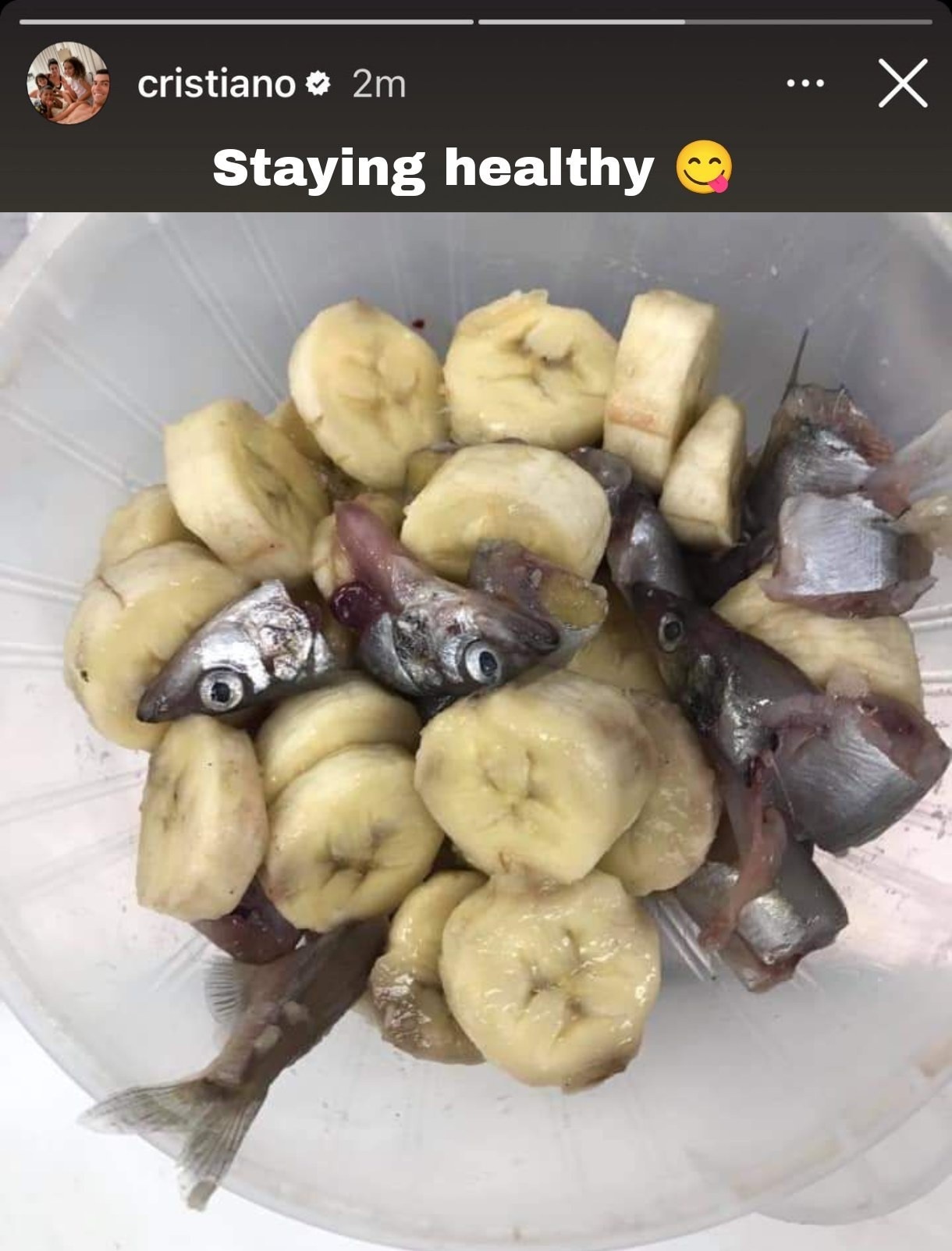 Mạng xã hội lan truyền hình ảnh được cho là bữa ăn "healthy" của Cristiano Ronaldo. Bữa ăn gồm chuối cắt khoanh và cá nhỏ, kèm chú thích: "Staying healthy" (Tạm dịch: Giữ sức khỏe), gán với tài khoản Instagram mang tên nam cầu thủ.