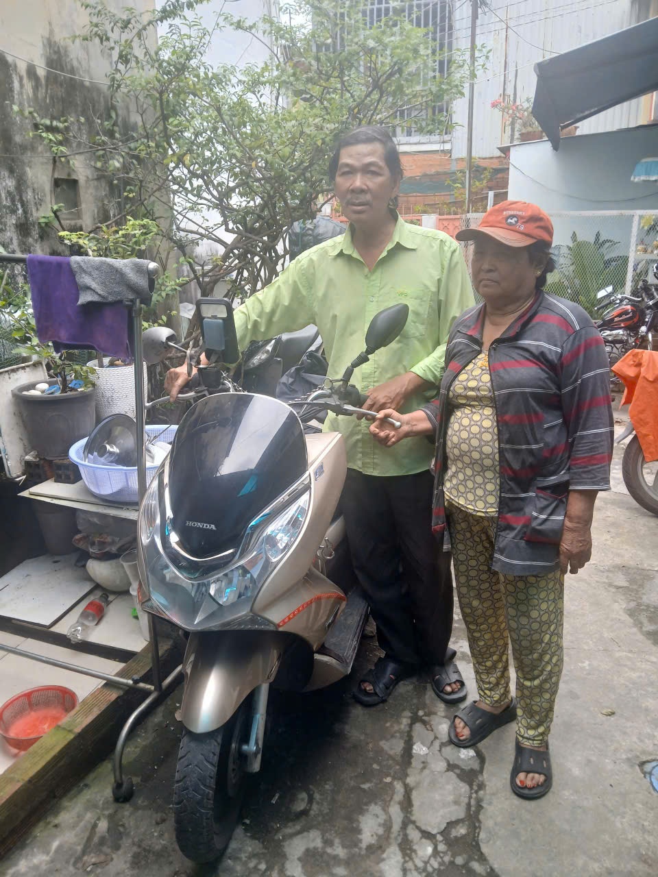 Ông Sơn và vợ bên chiếc xe dùng để hành nghề xe ôm công nghệ. Ảnh: NVCC.