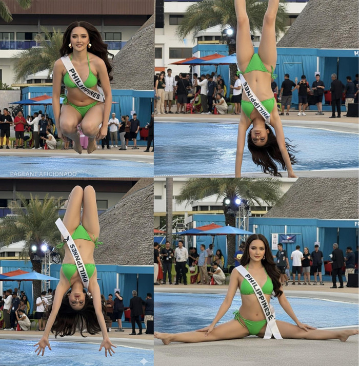 Tuy nhiên, bên cạnh những màn khoe vóc dáng chỉn chu, mạng xã hội bất ngờ dậy sóng khi đại diện Philippines, Ahtisa Manalo, đăng tải loạt ảnh ghi lại cảnh cô thực hiện các động tác nhào lộn trong trang phục bikini tại khu vực hồ bơi của sự kiện. Các bức ảnh cho thấy người đẹp thực hiện chuỗi động tác khó như bật nhảy, trồng cây chuối hay xoạc dọc trên nền sân khấu, khiến cộng đồng sắc đẹp không khỏi sửng sốt.