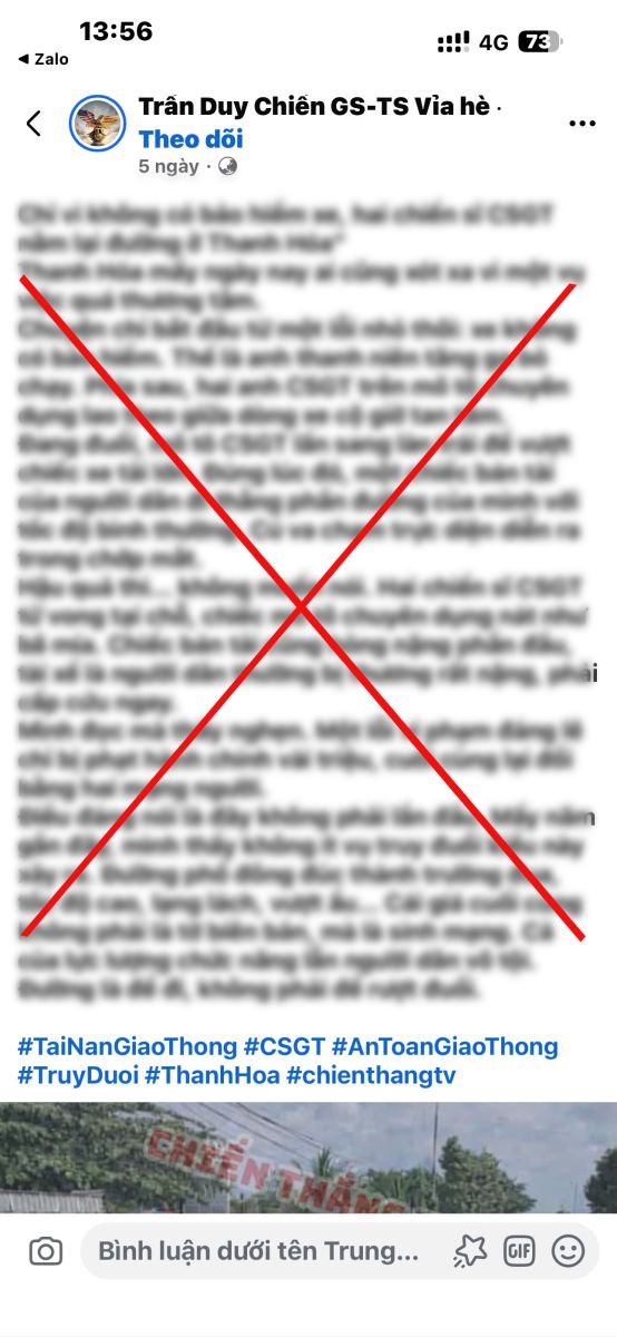 Thời gian gần đây, trên mạng xã hội Facebook xuất hiện bài viết của tài khoản "Trần Duy Chiến GS-TS Vỉa hè" đăng tải thông tin cho rằng "hai chiến sĩ CSGT nằm lại đường ở Thanh Hóa do truy đuổi phương tiện vi phạm giao thông". Nội dung bài viết nhanh chóng được một số tài khoản chia sẻ lại, kèm theo nhiều bình luận suy diễn, gây hoang mang trong dư luận.