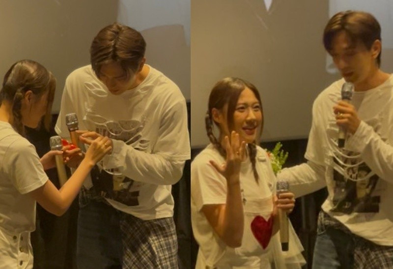 Theo Thương Trường, trong clip đang được cư dân mạng lan truyền, Thuận Nguyễn lấy ra một cặp nhẫn và ngỏ lời với Uyển Ân: "Để anh đeo vào tay em nha". Sau đó, cả hai trao nhẫn cho nhau. Ảnh: Thương Trường.