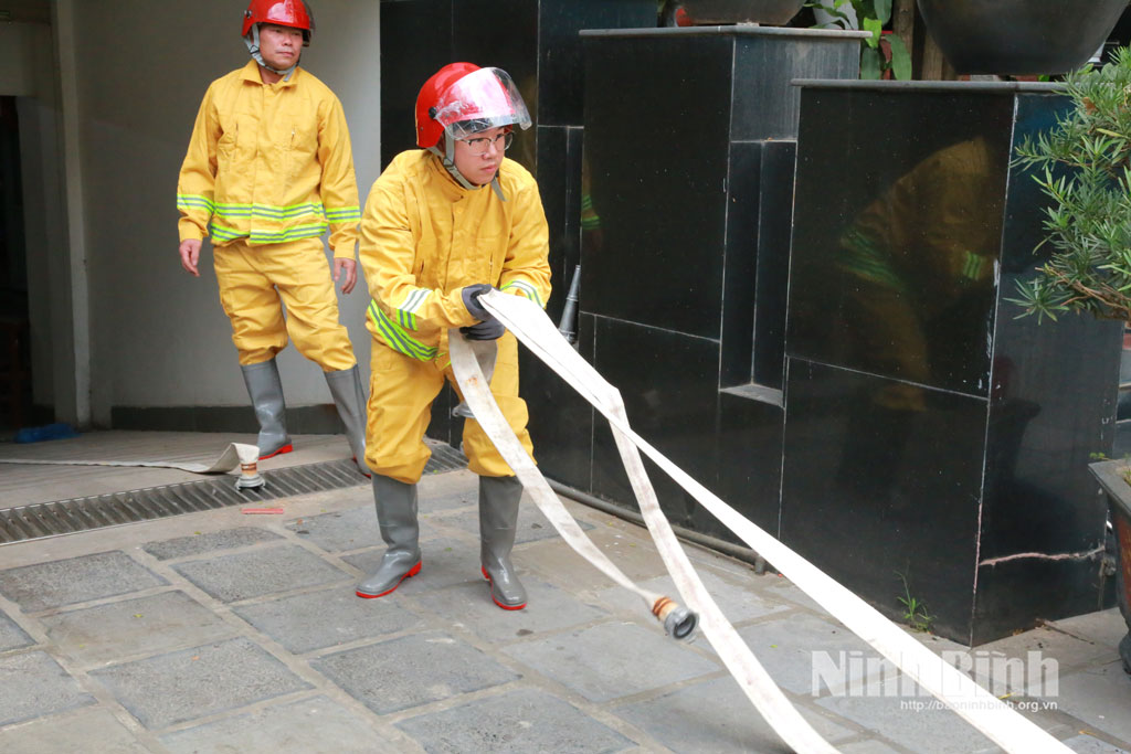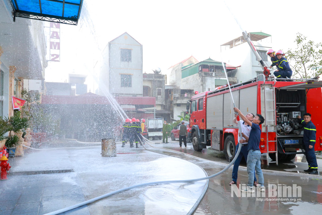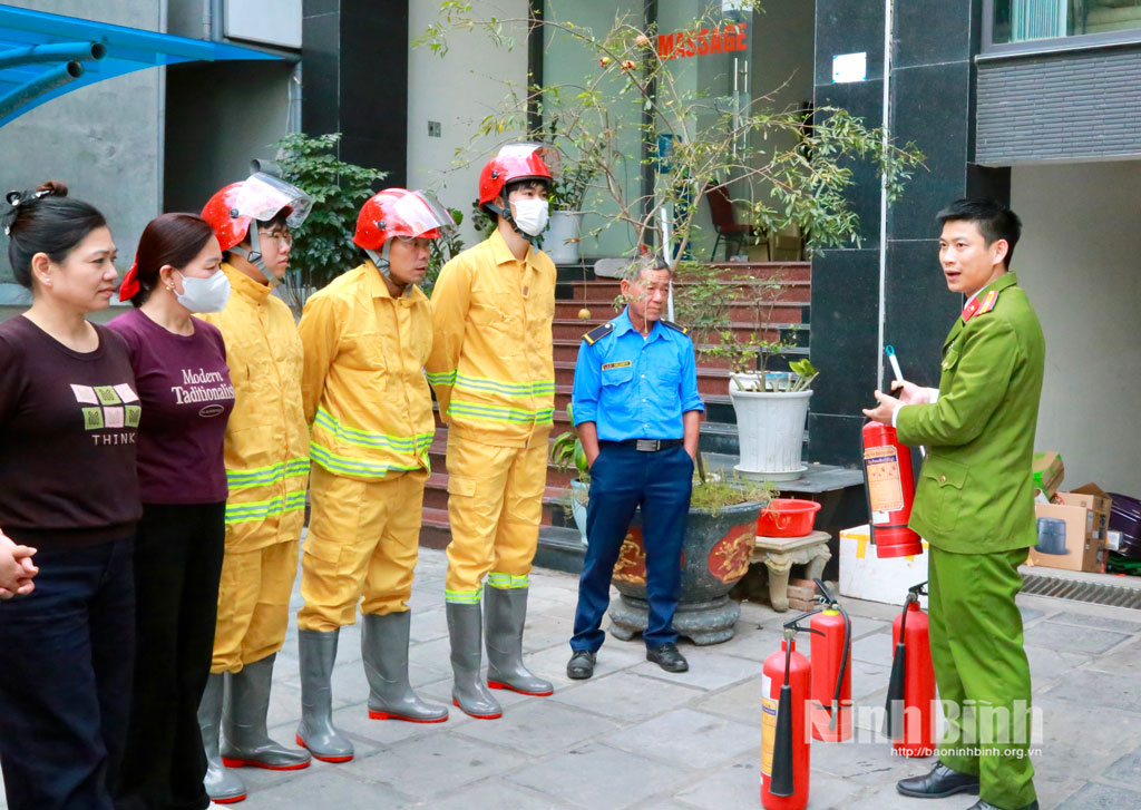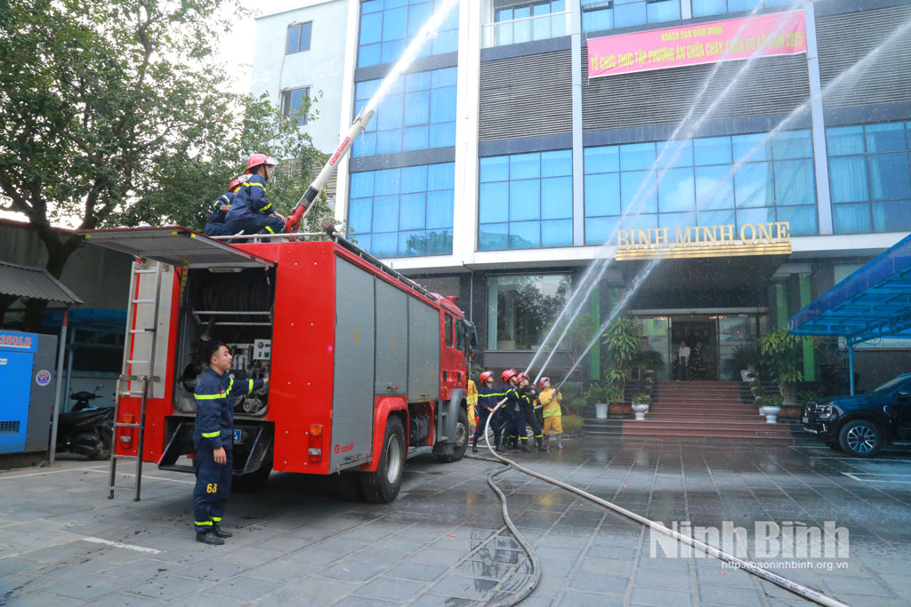 Ngay sau đó, buổi thực tập phương án chữa cháy và CNCH được triển khai với tình huống giả định xảy ra cháy tại cơ sở lưu trú, lực lượng tại chỗ nhanh chóng tổ chức báo động, cắt điện, triển khai chữa cháy ban đầu, đồng thời nhanh chóng báo tin xảy ra vụ cháy cho Công an phường Đồng Văn và lực lượng Cảnh sát PCCC và CNCH, Công an tỉnh Ninh Bình.