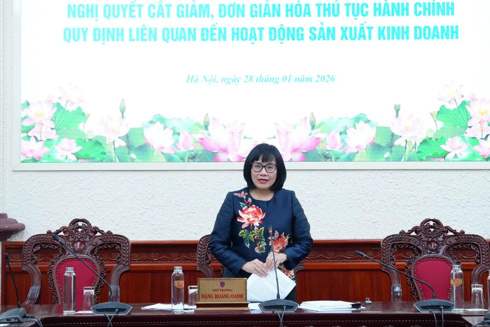 Thứ trưởng Bộ Tư pháp Đặng Hoàng Oanh phát biểu tại cuộc họp Hội đồng thẩm định độc lập dự thảo Nghị quyết của Chính phủ về cắt giảm, đơn giản hóa thủ tục hành chính, quy định liên quan đến hoạt động sản xuất, kinh doanh