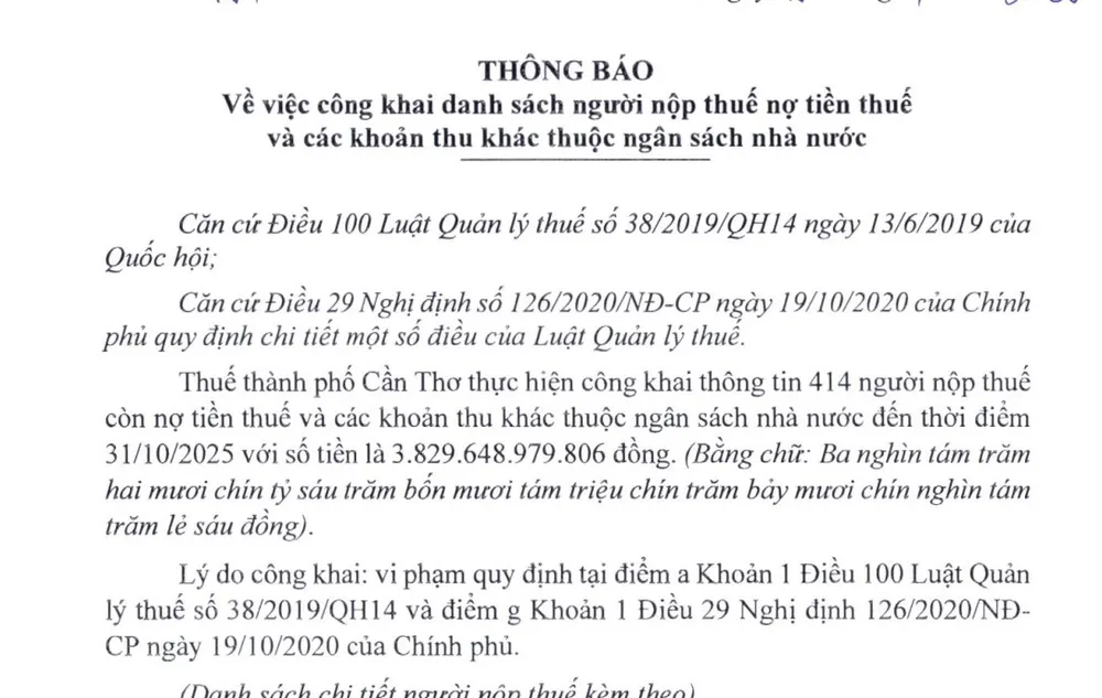 Theo đó, Thuế TP Cần Thơ công khai thông tin 414 người nộp thuế còn nợ tiền thuế và các khoản thu khác thuộc ngân sách nhà nước đến thời điểm ngày 31-10-2025 với số tiền hơn 3.829 tỉ đồng.