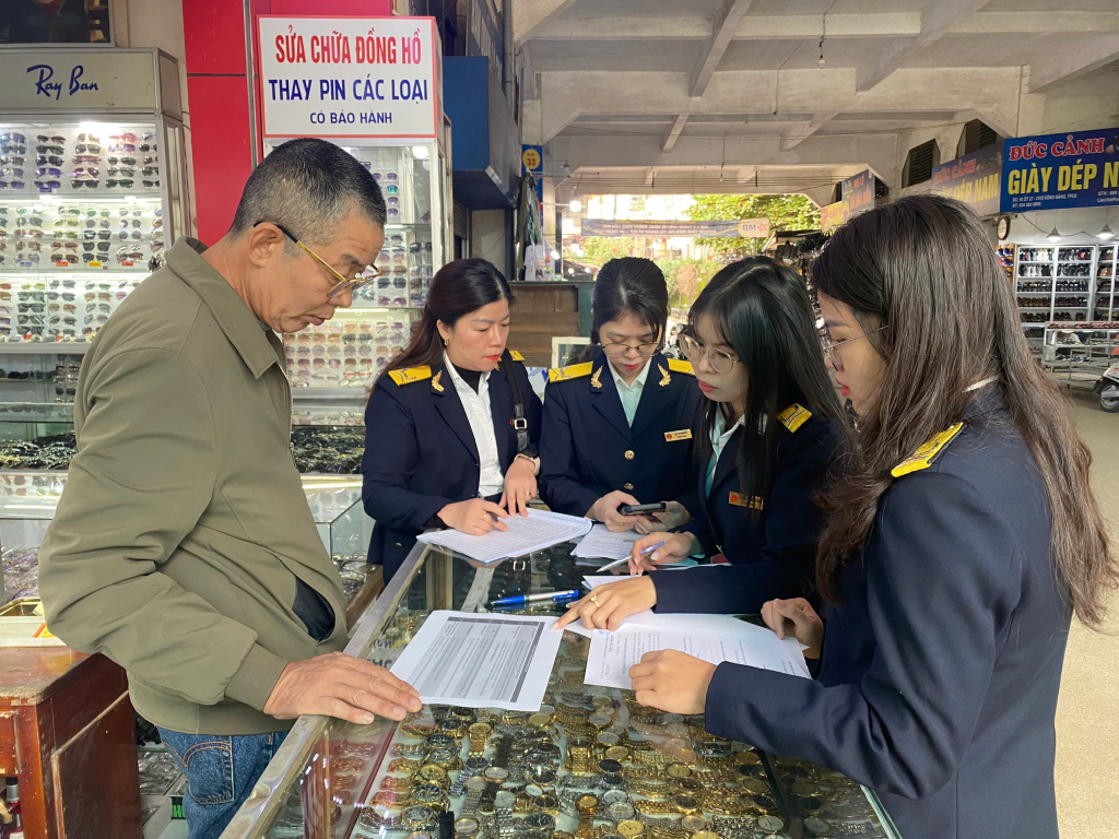 Công chức thuế hỗ trợ hộ kinh doanh chuyển đổi từ thuế khoán sang tự kê khai và nộp thuế tại Chợ Trung tâm.