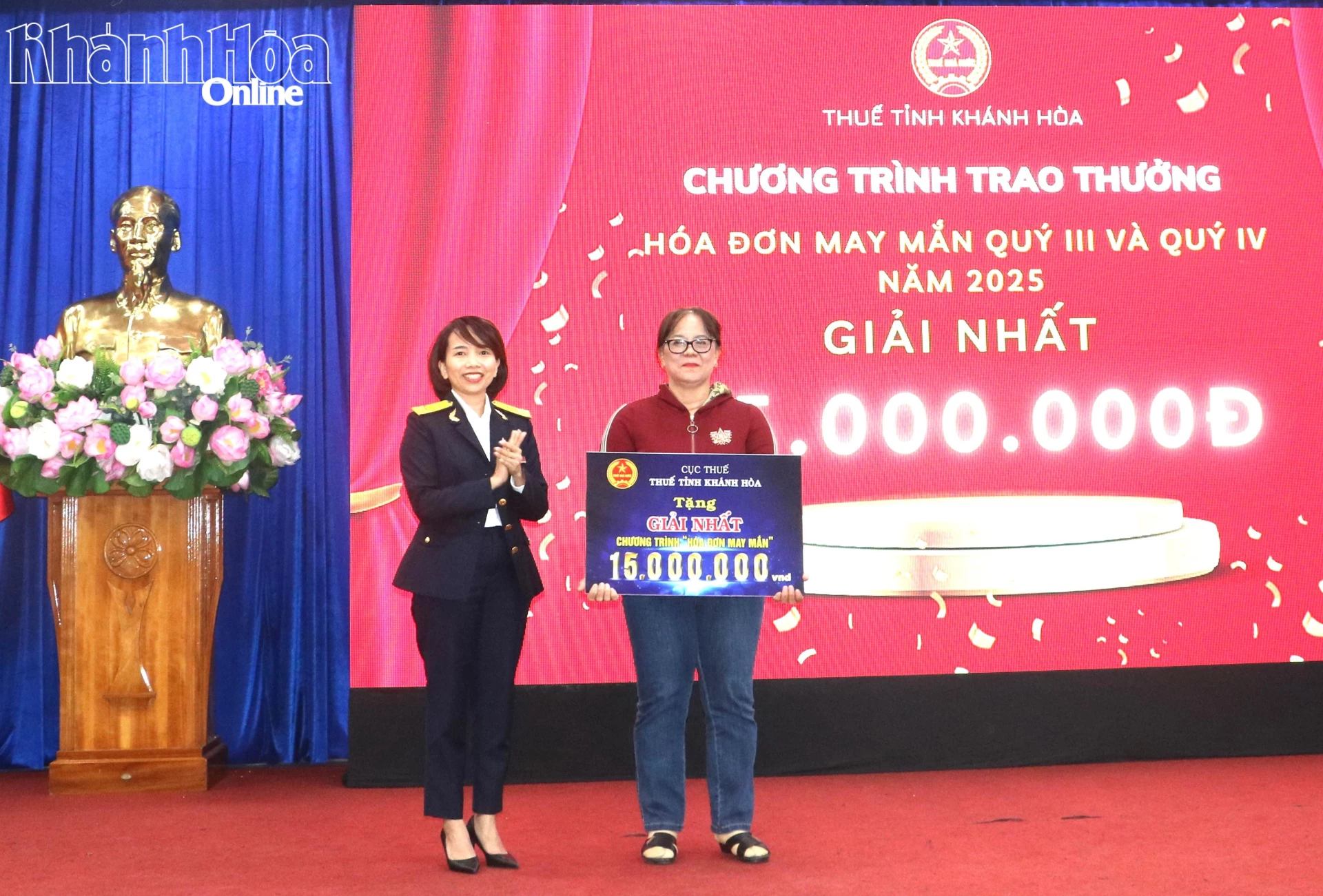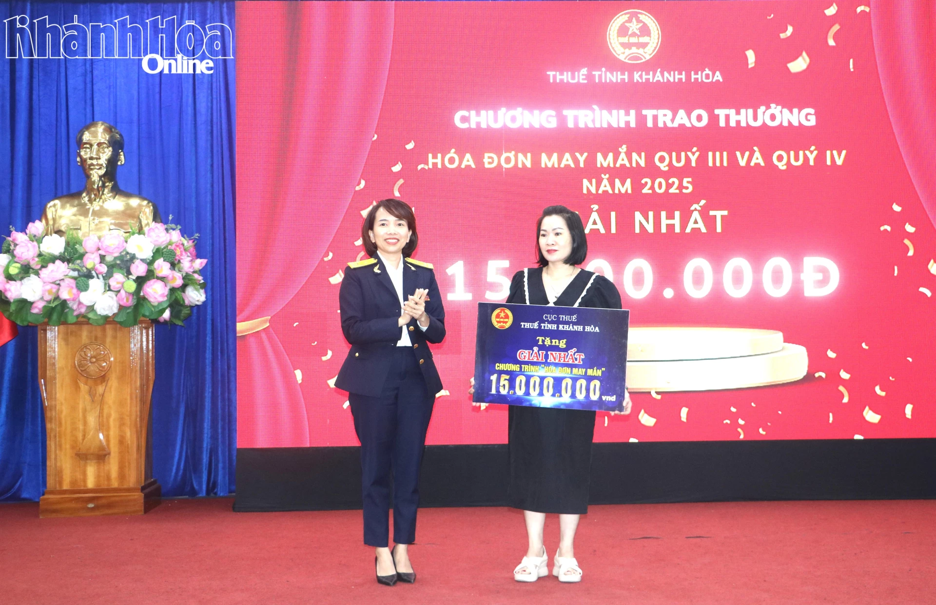Tại chương trình, Thuế tỉnh đã trao thưởng cho 54 cá nhân, hộ kinh doanh với tổng trị giá 212 triệu đồng. Trong đó, giải nhất được trao cho bà Nguyễn Thị Kim Loan (xã Nam Cam Ranh) và bà Nguyễn Lương Tường Việt (phường Nha Trang), mỗi giải trị giá 15 triệu đồng. Ngoài ra, Ban tổ chức trao 6 giải nhì (10 triệu đồng/giải), 10 giải ba (5 triệu đồng/giải) và 36 giải khuyến khích (2 triệu đồng/giải) cho các cá nhân, hộ kinh doanh khác.
