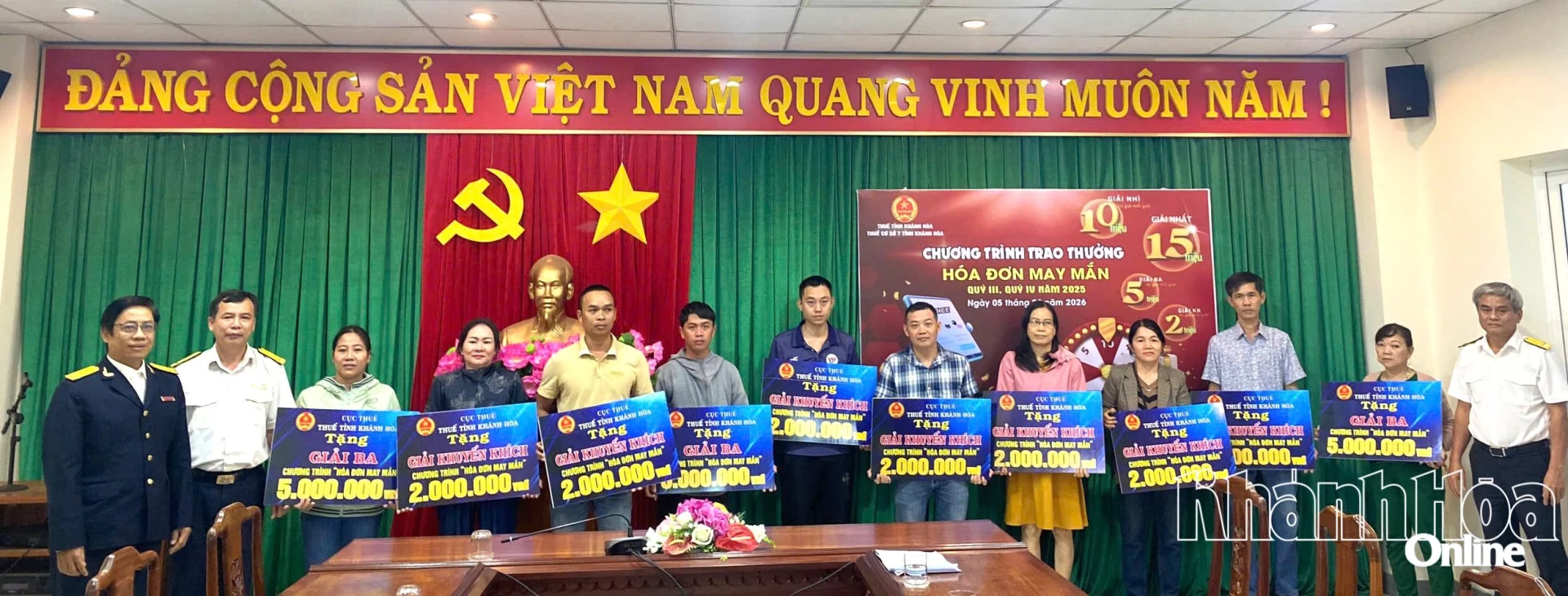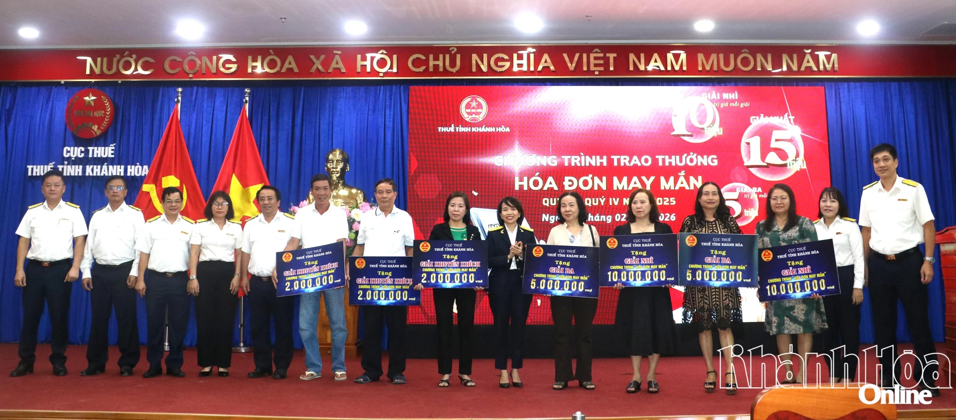 Chiều 5-2, Thuế tỉnh Khánh Hòa tổ chức chương trình trao thưởng “Hóa đơn may mắn” quý III và quý IV năm 2025. Chương trình được kết nối trực tuyến tới điểm cầu Thuế cơ sở 7 (phường Đông Hải).