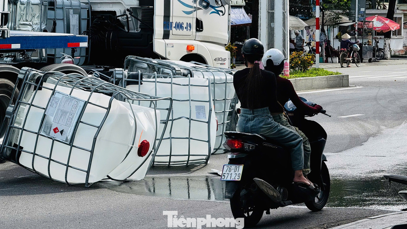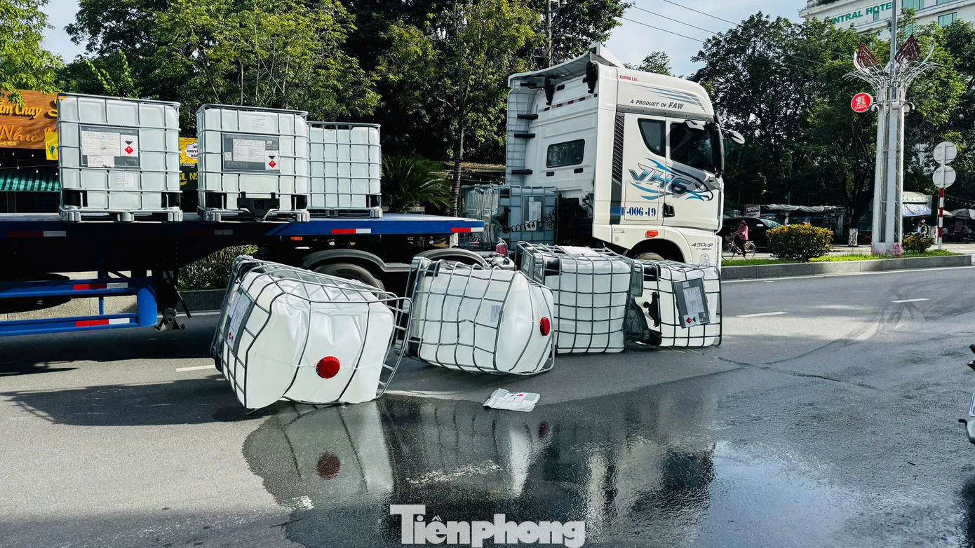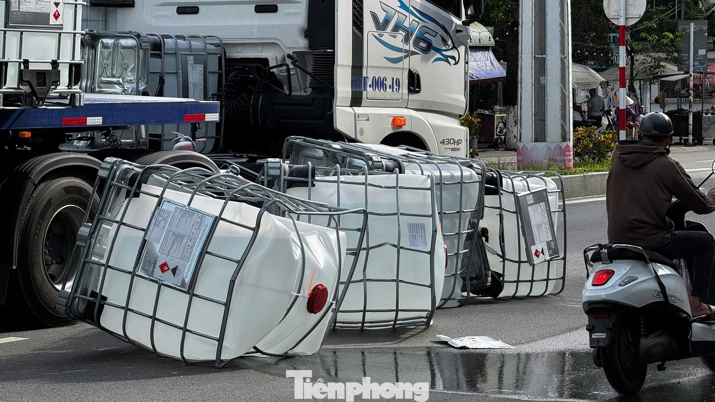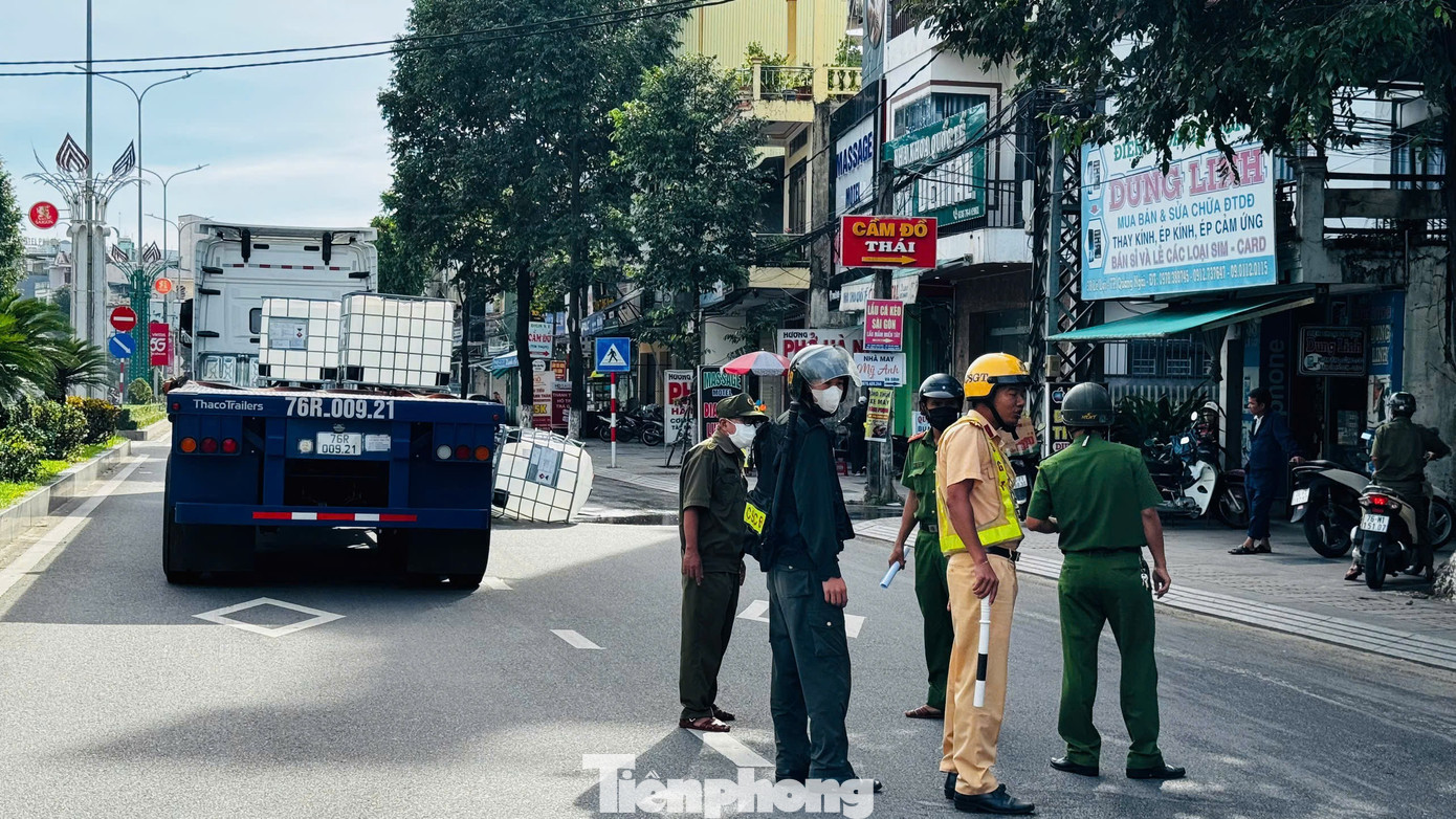Khi đến trước số nhà 36 (phường Cẩm Thành, tỉnh Quảng Ngãi), xe bất ngờ gặp sự cố khiến 4 thùng chất lỏng lớn rơi xuống mặt đường, đổ tràn ra khắp nơi.