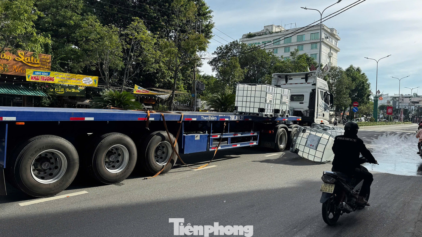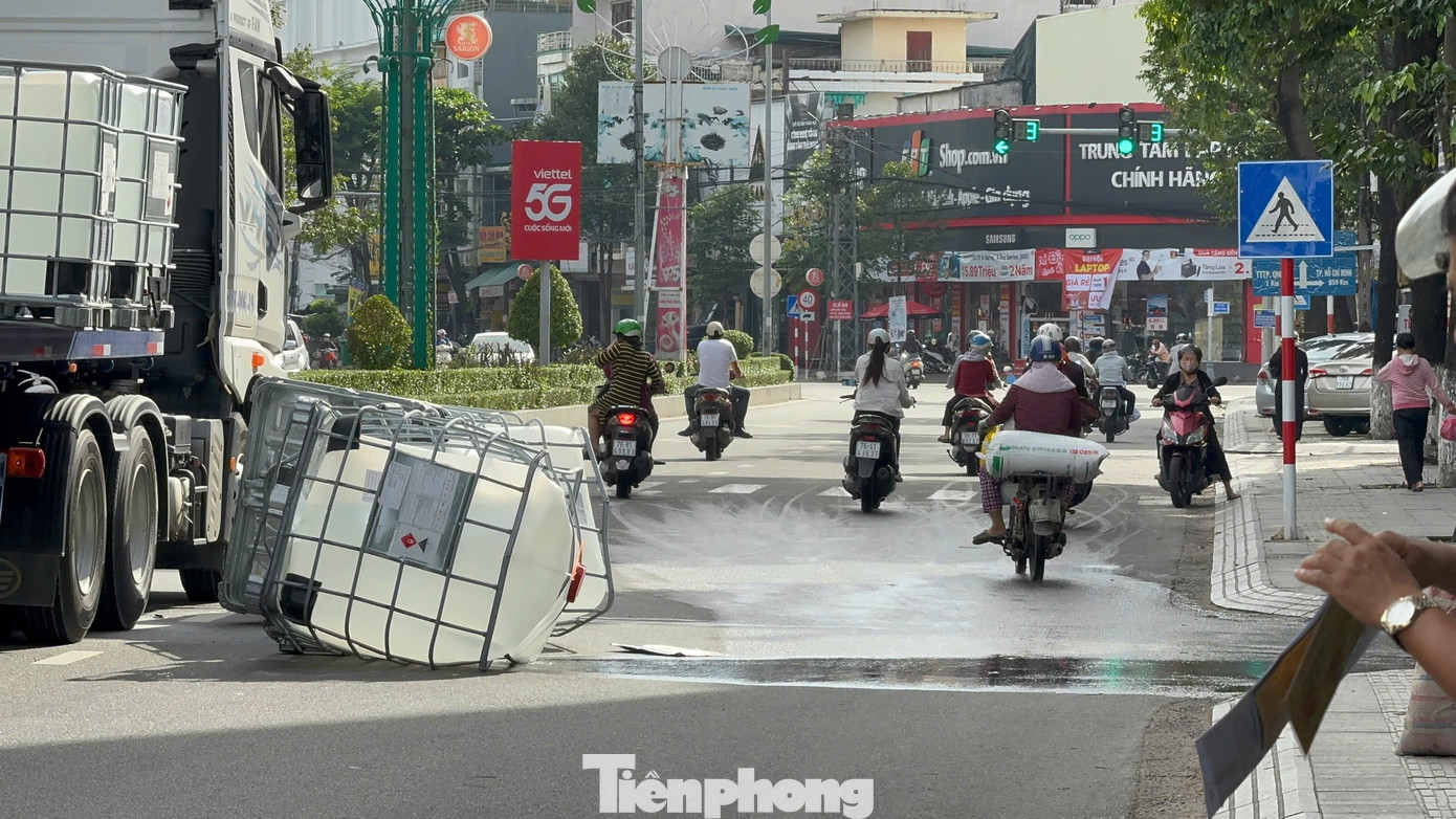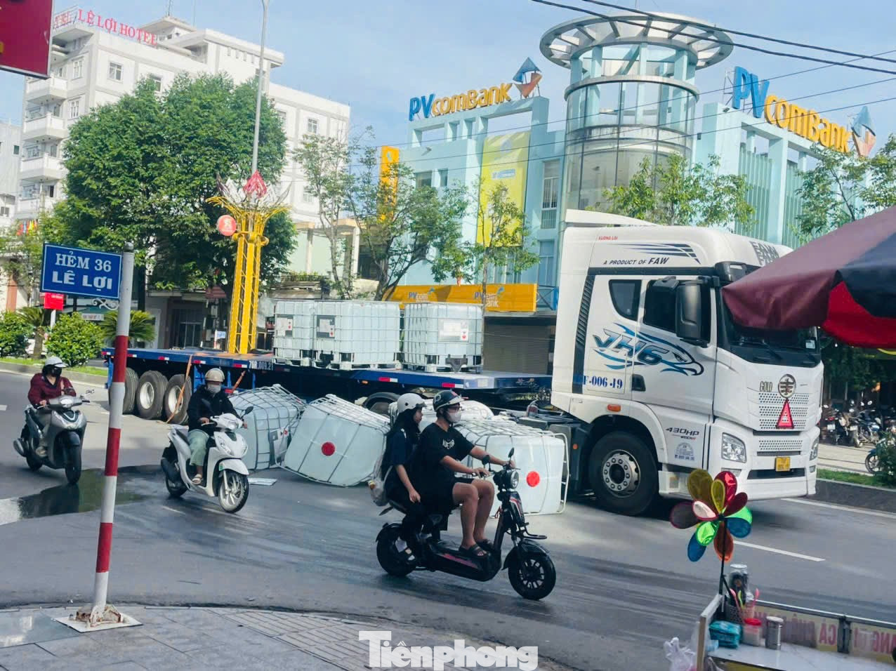 Khi đến trước số nhà 36 (phường Cẩm Thành, tỉnh Quảng Ngãi), xe bất ngờ gặp sự cố khiến 4 thùng chất lỏng lớn rơi xuống mặt đường, đổ tràn ra khắp nơi.