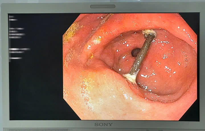 Qua khai thác tiền sử và thăm khám, các bác sĩ nghi ngờ người bệnh có dị vật đường tiêu hóa và chỉ định nội soi dạ dày. Kết quả cho thấy, tại vị trí hang vị có dị vật dạng que dài khoảng 5cm, cắm sâu hai đầu vào thành dạ dày.