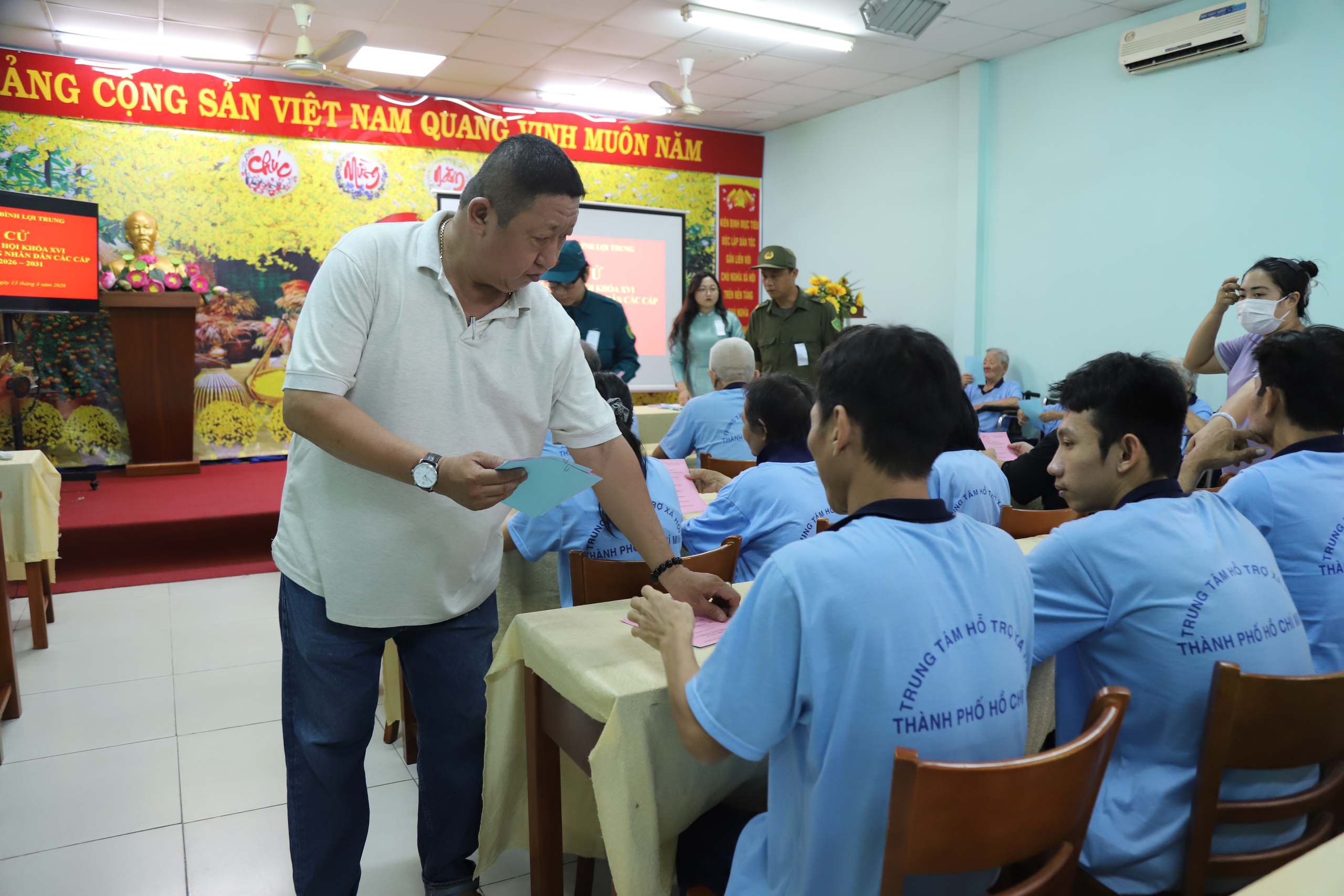 Ngày 15-3, phường Bình Lợi Trung, TPHCM đã đưa thùng phiếu lưu động đến Trung tâm Bảo trợ xã hội TPHCM, tạo điều kiện để các cử tri có hoàn cảnh đặc biệt đang được chăm sóc tại đây trực tiếp tham gia bầu cử đại biểu Quốc hội khóa XVI và đại biểu HĐND các cấp nhiệm kỳ 2026 - 2031.