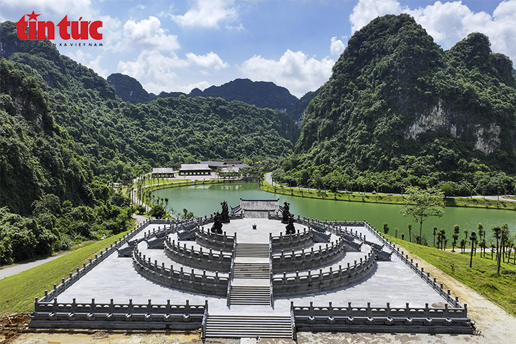 Toàn cảnh Đàn Kính Thiên nhìn từ trên cao, công trình được phục dựng hài hòa với cảnh quan núi đá vôi và hồ nước tự nhiên.