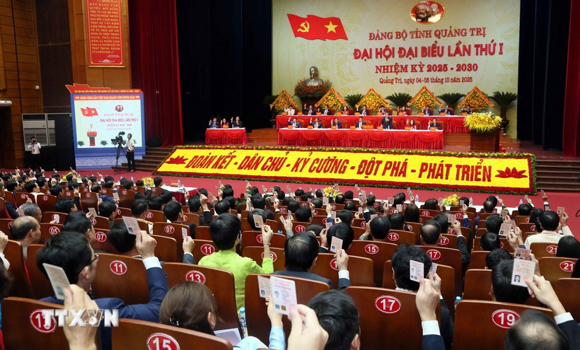 Đại biểu biểu quyết thông qua Dự thảo Nghị quyết Đại hội đại biểu Đảng bộ tỉnh Quảng Trị lần thứ nhất, nhiệm kỳ 2025-2030. (Ảnh: Tá Chuyên/TTXVN)