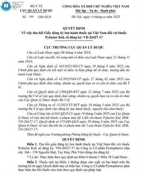 Ngày 13/10/2025, Cục Quản lý Dược vừa ban hành quyết định số 549/QD-QLD về việc thu hồi Giấy đăng ký lưu hành thuốc tại Việt Nam đối với thuốc Pyfaclor Kid.