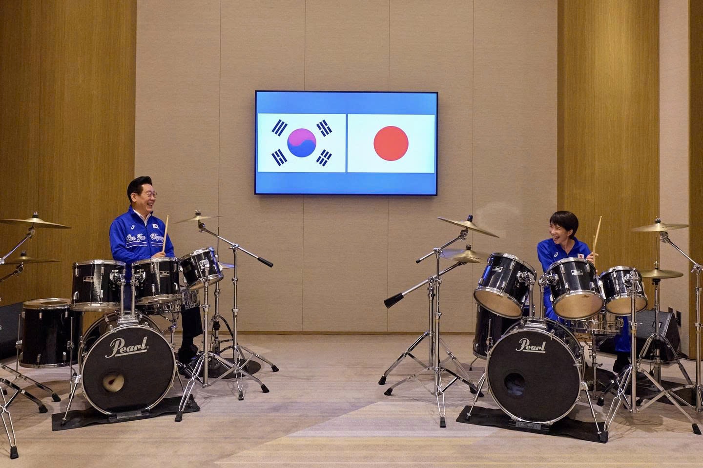 Tổng thống Hàn Quốc Lee Jae Myung và Thủ tướng Nhật Bản Sanae Takaichi cùng chơi trống trong chuyến thăm Nara, Nhật Bản ngày 13/1. Ảnh: Korea Joongang Daily